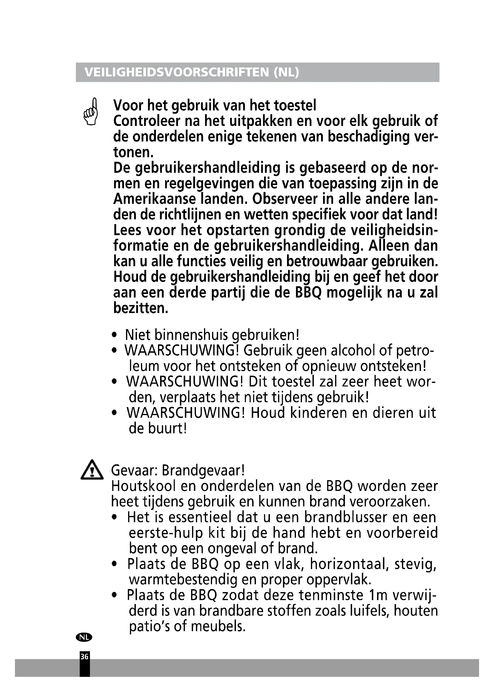 Voor het gebruik van het toestel Controleer na het uitpakken en voor elk gebruik of de onderdelen enige tekenen van beschadiging ver- tonen. De gebruikershandleiding is gebaseerd op de nor- men en regelgevingen die van toepassing zijn in de Amerikaanse landen. Observeer in alle andere lan- den de richtlijnen en wetten specifiek voor dat land! Lees voor het opstarten grondig de veiligheidsin- formatie en de gebruikershandleiding. Alleen dan kan u alle functies veilig en betrouwbaar gebruiken. Houd de gebruikershandleiding bij en geef het door aan een derde partij die de BBQ mogelijk na u zal bezitten.