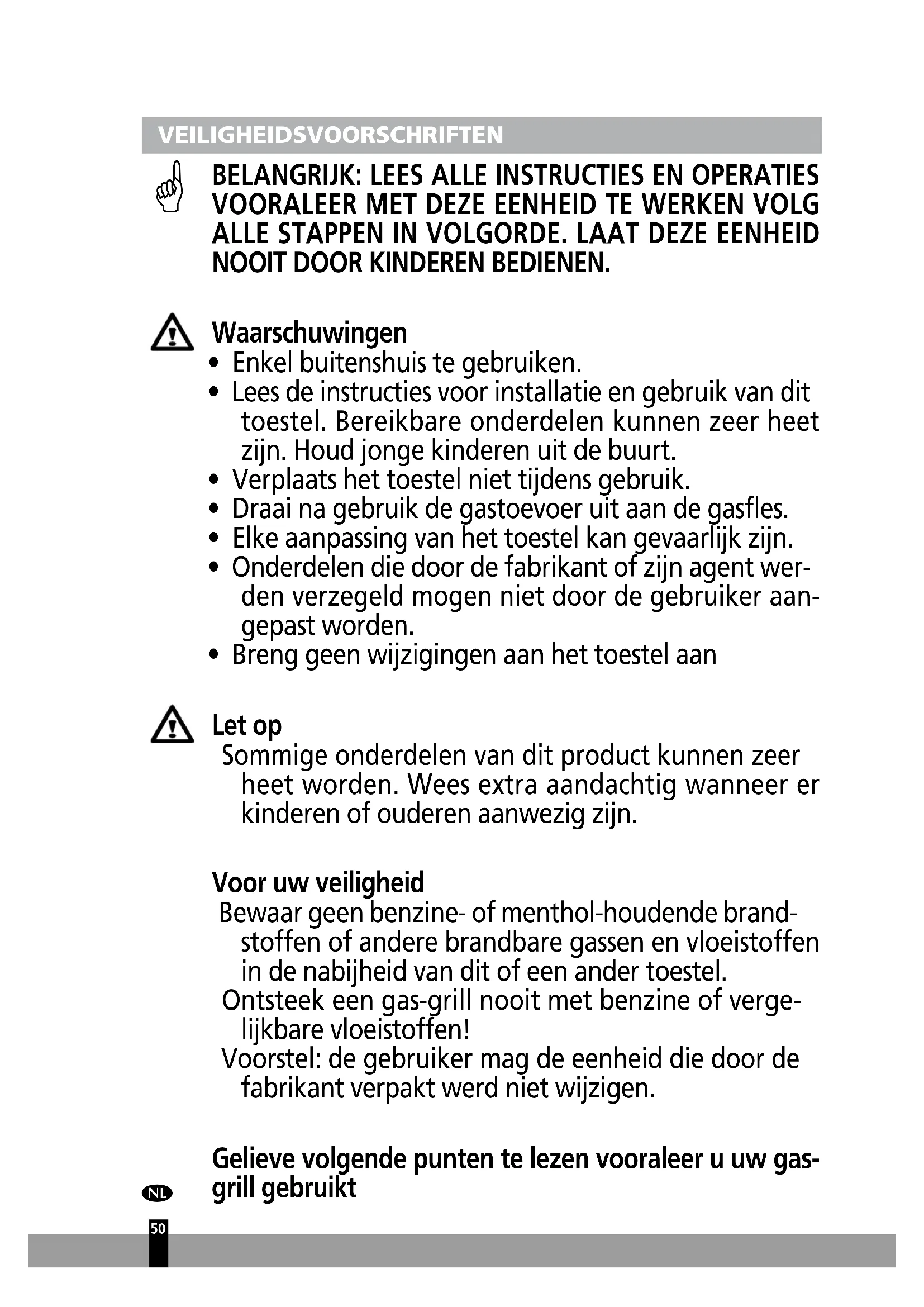 - Breng geen wijzigingen aan het toestel aan Let op Sommige onderdelen van dit product kunnen zeer heet worden. Wees extra aandachtig wanneer er kinderen of ouderen aanwezig zijn. Voor uw veiligheid Bewaar geen benzine- of menthol-houdende brand- stoffen of andere brandbare gassen en vloeistoffen in de nabijheid van dit of een ander toestel. Ontsteek een gas-grill nooit met benzine of verge- lijkbare vloeistoffen! Voorstel: de gebruiker mag de eenheid die door de fabrikant verpakt werd niet wijzigen. Gelieve volgende punten te lezen vooraleer u uw gas- grill gebruikt