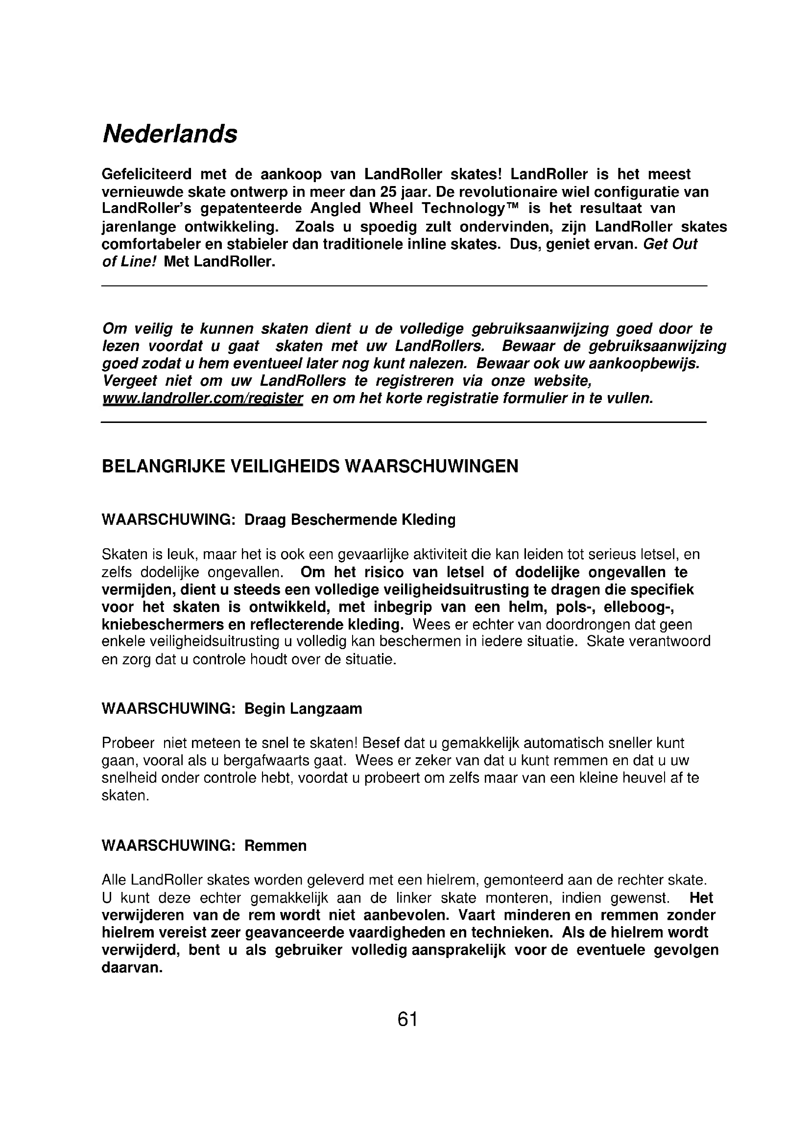 WAARSCHUWING: Gebruik Uitsluitend Voor Recreatieve Doeleinden LandRoller skates zijn uitsluitend bedoeld voor recreatieve doeleinden. U gebruikt dit product op eigen risico. LandRoller, Inc. aanvaardt geen verantwoordelijkheid voor onachtzaam of roekeloos gebruik. Kinderen mogen dit product alleen gebruiken onder toezicht van volwassenen. U bent zelf verantwoordelijk voor elk risico op persoonlijk letsel of schade aan persoonlijke eigendommen.