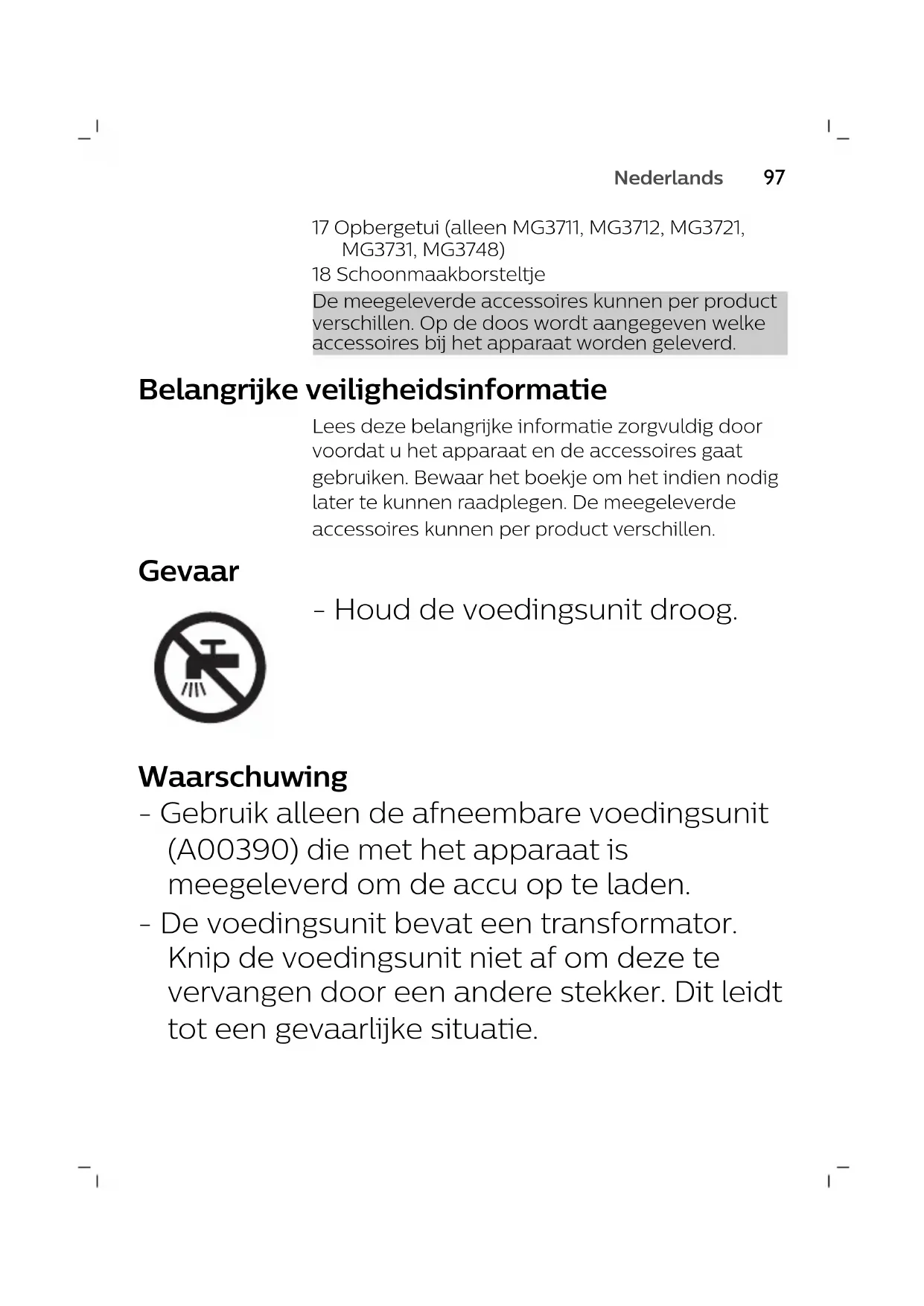 Nederlands17 Opbergetui (alleen MG3711, MG3712, MG3721, MG3731, MG3748) 18 Schoonmaakborsteltje De meegeleverde accessoires kunnen per product verschillen. Op de doos wordt aangegeven welke accessoires bij het apparaat worden geleverd. Belangrijke veiligheidsinformatie Lees deze belangrijke informatie zorgvuldig door voordat u het apparaat en de accessoires gaat gebruiken. Bewaar het boekje om het indien nodig later te kunnen raadplegen. De meegeleverde accessoires kunnen per product verschillen. Gevaar - Houd de voedingsunit droog. Waarschuwing - Gebruik alleen de afneembare voedingsunit (A00390) die met het apparaat is meegeleverd om de accu op te laden. - De voedingsunit bevat een transformator. Knip de voedingsunit niet af om deze te vervangen door een andere stekker. Dit leidt tot een gevaarlijke situatie.