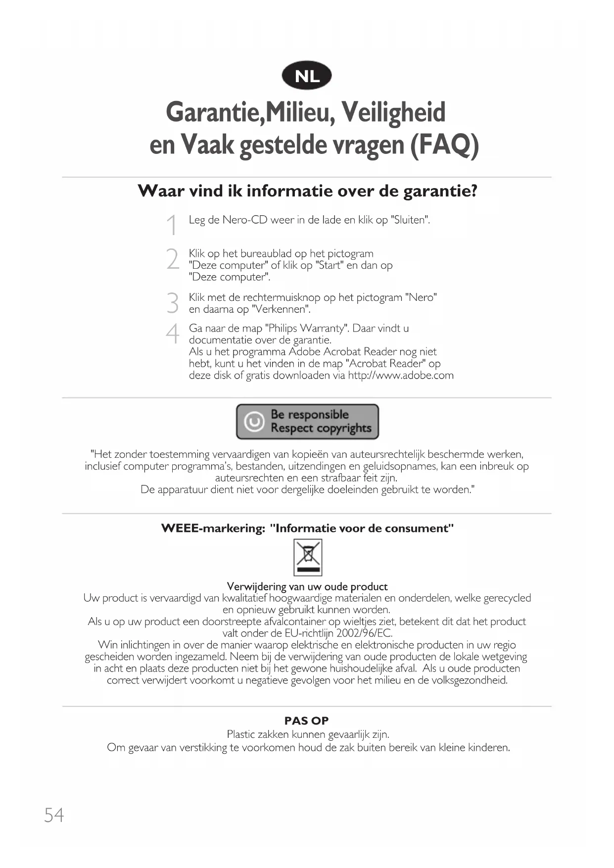 Garantie, Milieu, Veiligheid en Vaak gestelde vragen (FAQ) 54
