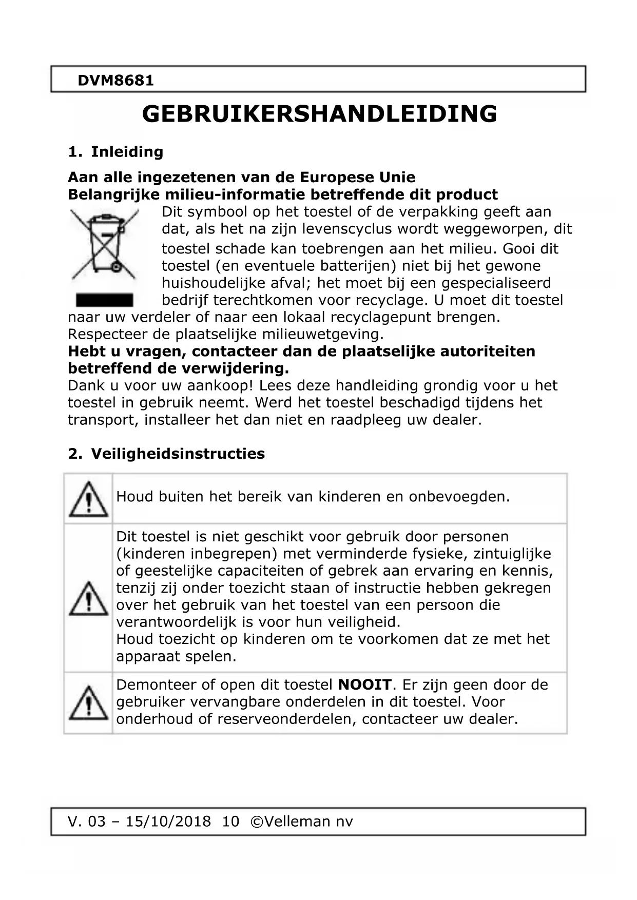 Gebruik dit toestel enkel met originele accessoires. Velleman nv is niet aansprakelijk voor schade of kwetsuren bij (verkeerd) gebruik van dit toestel. Voor meer informatie over dit product en de laatste versie van deze handleiding, zie www.velleman.eu. De informatie in deze handleiding kan te allen tijde worden gewijzigd zonder voorafgaande kennisgeving. De batterij, verkeerd gebruik, misbruik, wijzigingen, modificaties, verwaarlozing, nalatig onderhoud en schade door lekkende batterijen vallen niet onder de garantie van Velleman nv. Een toestel onder garantie moet bij inlevering voor reparatie vergezeld zijn van het aankoopbewijs. De garantie vervalt wanneer u het toestel opent. © AUTEURSRECHT Velleman nv heeft het auteursrecht voor deze handleiding. Alle wereldwijde rechten voorbehouden. Het is niet toegestaan om deze handleiding of gedeelten ervan over te nemen, te kopiëren, te vertalen, te bewerken en op te slaan op een elektronisch medium zonder voorafgaande schriftelijke toestemming van de rechthebbende.DVM8681