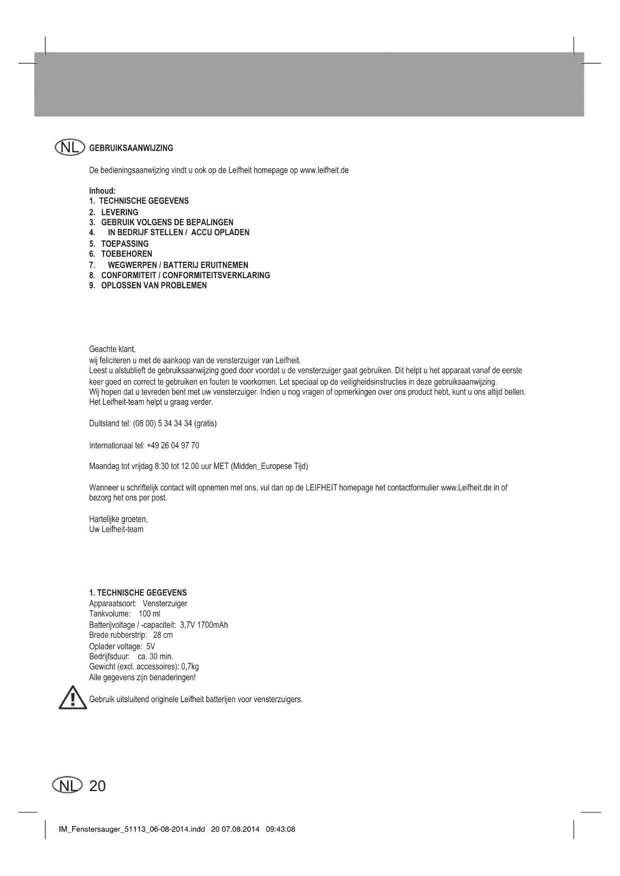 Geachte klant, wij feliciteren u met de aankoop van de vensterzuiger van Leifheit. Leest u alstublieft de gebruiksaanwijzing goed door voordat u de vensterzuiger gaat gebruiken. Dit helpt u het apparaat vanaf de eerste keer goed en correct te gebruiken en fouten te voorkomen. Let speciaal op de veiligheidsinstructies in deze gebruiksaanwijzing. Wij hopen dat u tevreden bent met uw vensterzuiger. Indien u nog vragen of opmerkingen over ons product hebt, kunt u ons altijd bellen. Het Leifheit-team helpt u graag verder. Duitsland tel: (08 00) 5 34 34 34 (gratis) Internationaaltel:+4926049770 Maandag tot vrijdag 8:30 tot 12.00 uur MET (Midden_Europese Tijd) Wanneer u schriftelijk contact wilt opnemen met ons, vul dan op de LEIFHEIT homepage het contactformulier www.Leifheit.de in of bezorg het ons per post. Hartelijke groeten, Uw Leifheit-team