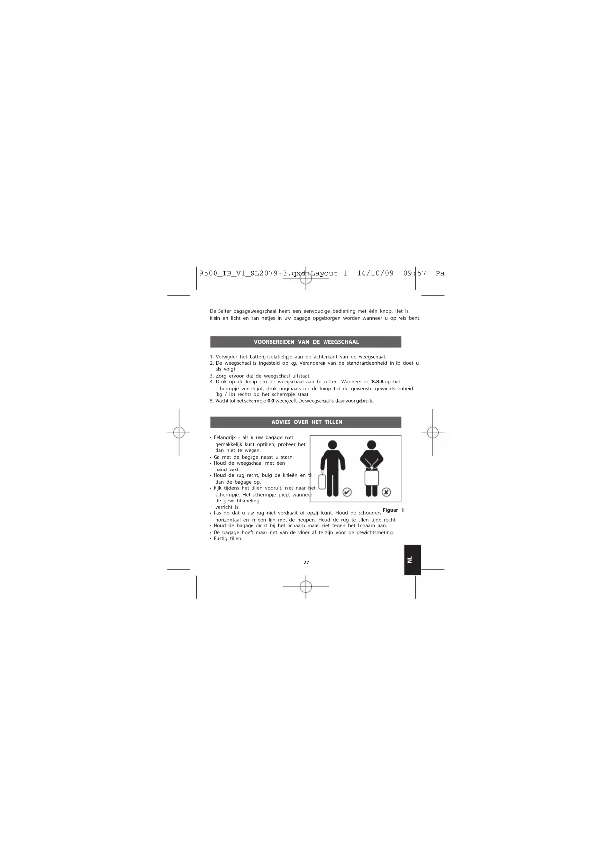 - Na aoop van de meting, laat de bagage rustig zakken op dezelfde manier als het tillen. (De juiste tilmethode is afgebeeld op guur 1 ) 9500_IB_V1_SL2079-3.qxd:Layout 1 14/10/09 09:57 Page 2829