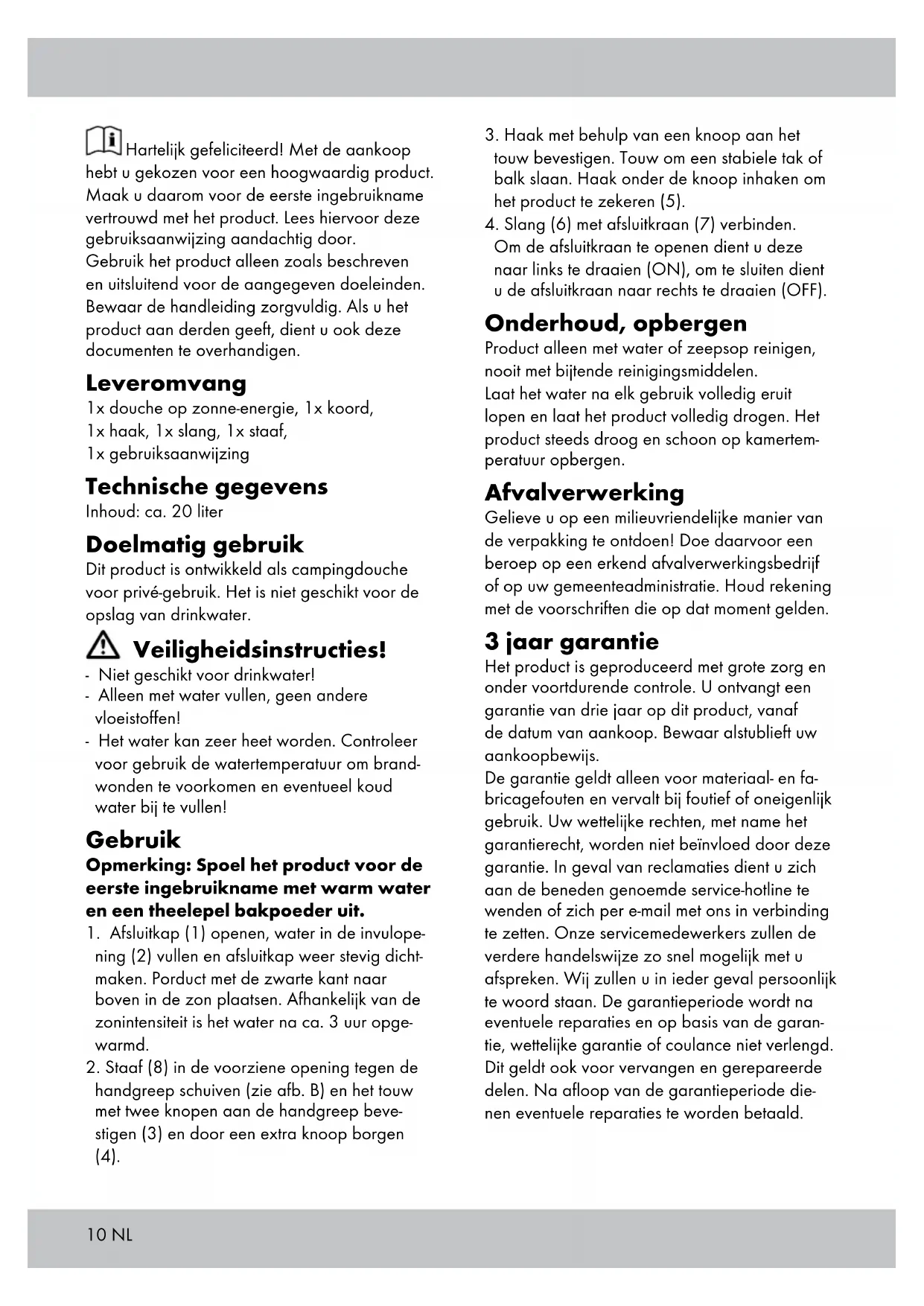 Om de afsluitkraan te openen dient u deze naar links te draaien (ON), om te sluiten dient u de afsluitkraan naar rechts te draaien (OFF). Onderhoud, opbergen Product alleen met water of zeepsop reinigen, nooit met bijtende reinigingsmiddelen. Laat het water na elk gebruik volledig eruit lopen en laat het product volledig drogen. Het product steeds droog en schoon op kamertem- peratuur opbergen. Afvalverwerking Gelieve u op een milieuvriendelijke manier van de verpakking te ontdoen! Doe daarvoor een beroep op een erkend afvalverwerkingsbedrijf of op uw gemeenteadministratie. Houd rekening met de voorschriften die op dat moment gelden. 3 jaar garantie Het product is geproduceerd met grote zorg en onder voortdurende controle. U ontvangt een garantie van drie jaar op dit product, vanaf de datum van aankoop. Bewaar alstublieft uw aankoopbewijs. De garantie geldt alleen voor materiaal- en fa- bricagefouten en vervalt bij foutief of oneigenlijk gebruik. Uw wettelijke rechten, met name het garantierecht, worden niet beïnvloed door deze garantie. In geval van reclamaties dient u zich aan de beneden genoemde service-hotline te wenden of zich per e-mail met ons in verbinding te zetten. Onze servicemedewerkers zullen de verdere handelswijze zo snel mogelijk met u afspreken. Wij zullen u in ieder geval persoonlijk te woord staan. De garantieperiode wordt na eventuele reparaties en op basis van de garan- tie, wettelijke garantie of coulance niet verlengd. Dit geldt ook voor vervangen en gerepareerde delen. Na afloop van de garantieperiode die- nen eventuele reparaties te worden betaald.11NL IAN: 79837 Service Nederland Tel.: 0900 0400223 (0,10 EUR/Min.) E-Mail: deltasport@lidl.nl Reserve-onderdelen voor uw product vindt u ook via: www.delta-sport.com, rubriek Service - reserve-onderdelen- service Lidl12 Congratulations! With your purchase you have decided on a high-quality product. Get to know the product before you start to use it. Carefully read the following instructions for use. Use the product only as described and only for the given areas of application. Keep these instructions safe. When passing the product on to a third party, always make sure that the documentation is included. Contents 1x solar-powered shower, 1x rope, 1x hook, 1x tube, 1x rod, 1x instructions for use Technical Specifications Capacity: approx. 20 litres Intended Use This item was designed as a camping shower for private use. Not suitable for storing drinking water. Safety! - Not suitable for drinking water. - Only fill with water, do not use other liquids. - Water may become very hot. Test water temperature before use to avoid scalding, add cold water if necessary. Use Note: Rinse product with warm water and a teaspoon baking powder prior to first use.