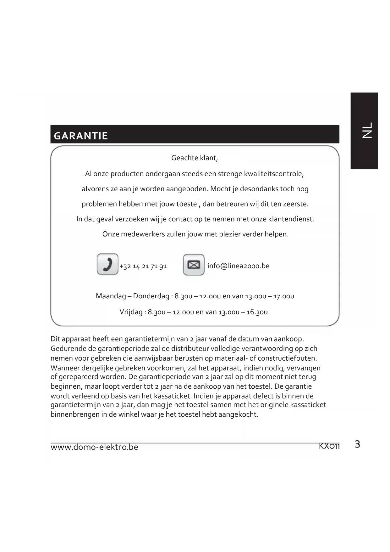 Dit apparaat heeft een garantietermijn van 2aar vanaf de datum van aankoop. Gedurende de garantiperiode zal de distributeur volledige verantwoording op zich nemen voor gebreken die aanwijsbaar berusten op materiaal- of constructiefouten. Wanner dergelijke gebreken voorkomen, zar het apparaat, indien nodig, verrangen of gerepareerd worden. De garantieteriode van 2aar zar op dit moment Niet terug beginnen, maar loopt verder tot 2aar na de aankoop van het toestel. De garantie wordt verleend op basis van het kassaticket. Indien je apparaat defect is binnen de garantietermijn van 2aar, dan mag je het toestel samen met het originele kassaticket binnenbrengen in de winkel waar je het toestel hebt aangekocht.