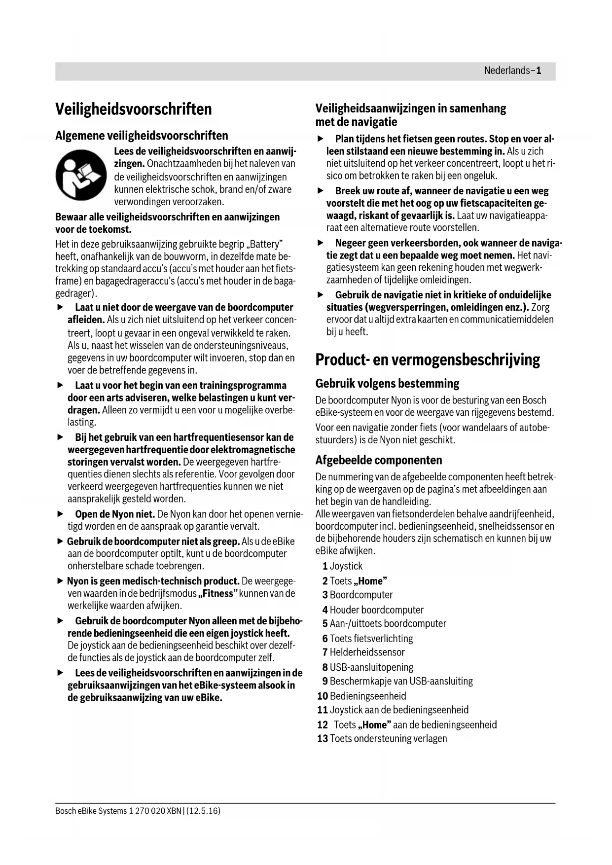 Errore versione del software Si prega di contattare il proprio rivenditore di eBike Bosch per far eseguire un aggiornamento software. 7xx Guasto al cambio Osservare le Istruzioni d’uso del costruttore del cambio. Tutte le spie sono spente Difetto interno del computer di bordo Riavviare il sistema eBike spegnendolo e riaccendendolo. Codice Causa RimediItaliano–12 1 270 020 XBN | (12.5.16) Bosch eBike Systems Alimentazione di energia di apparecchi esterni tramite il collegamento USB Con l’ausilio del collegamento USB possono essere fatti fun- zionare o ricaricati la maggior parte degli apparecchi la cui ali- mentazione di energia è possibile tramite USB (p.es. diversi cellulari). Presupposto per la carica è che il computer di bordo ed una batteria sufficientemente carica siano inseriti nell’eBike. Aprire il cappuccio di protezione 9 del collegamento USB sul computer di bordo. Allacciare il collegamento USB del dispo- sitivo esterno, mediante il cavo di ricarica USB Micro A–Micro B (disponibile presso il proprio rivenditore di eBike Bosch), alla presa USB 8 sul computer di bordo. Dopo avere scollegato l’utenza, il collegamento USB andrà ri- chiuso con cura, mediante l’apposito cappuccio di protezione 9. Il collegamento USB non è impermeabile. In caso di marcia sotto la pioggia, non è consentito collegare al- cun dispositivo esterno e il collegamento USB dovrà es- sere completamente chiuso dall’apposito cappuccio di protezione 9. Attenzione: le utenze collegate al Nyon possono pregiudicare l’autonomia dell’eBike. Indicazioni per la guida con il sistema eBike Trattamento e cura dell’eBike Prestare attenzione alle temperature di esercizio e d’imma- gazzinamento dei componenti eBike. Proteggere l’unità di azionamento, il computer di bordo e la batteria da temperatu- re estreme (ad es. da un forte irraggiamento solare senza con- temporanea ventilazione). I componenti (in particolare la bat- teria) possono essere danneggiati da temperature estreme. Tenete pulito il monitor del Vostro Nyon. In caso di imbratta- mento la luminosità può risultare non corretta. Nella modalità di navigazione la commutazione giorno/notte può essere falsata. A causa di un brusco cambiamento delle condizioni ambienta- li può verificarsi un appannamento interno del vetro. Dopo un breve lasso di tempo si verifica una compensazione della tem- peratura e l’appannamento scompare nuovamente. Manutenzione ed assistenza Manutenzione e pulizia Tutti i componenti, inclusa l’unità motrice, non andranno im- mersi in acqua, né puliti con un’idropulitrice. Per pulire il computer di bordo, utilizzare un panno morbido, inumidito esclusivamente con acqua. Non utilizzare alcun tipo di detergente. Sottoporre a verifica tecnica il sistema eBike almeno una volta all’anno (ad es. parte meccanica e grado di aggiornamento del software di sistema). Come ulteriore criterio per la scadenza di assistenza, il co- struttore o il rivenditore può adottare una percorrenza e/o un lasso di tempo. In tale caso, una volta acceso, il computer di bordo informerà della scadenza, visualizzando l’indicazione per 4 secondi. Per Service e riparazioni all’eBike rivolgersi ad un rivenditore autorizzato di biciclette. Far eseguire tutte le riparazioni necessarie esclusiva- mente da un rivenditore di biciclette autorizzato. Assistenza clienti e consulenza impieghi Per tutte le domande relative al sistema eBike ed ai suoi com- ponenti rivolgersi ad un rivenditore autorizzato di biciclette. Le informazioni per contattare rivenditori autorizzati di bici- clette sono riportate sulla pagina web www.bosch-ebike.com Trasporto Qualora si trasporti l’eBike all’esterno della propria vettura, ad es. su un portapacchi, prelevare il computer di bordo e il PowerPack, al fine di evitare danni. Smaltimento Unità di azionamento, computer di bordo incl. unità di comando, batteria, sensore di velocità, accessori e imballi devono essere riciclati in conformità con le normative ambientali. Non gettare l’eBike ed i suoi componenti tra i rifiuti domestici! Solo per i Paesi della CE: Conformemente alla direttiva europea 2012/19/UE gli apparecchi elettrici diventati inservibili e, in base alla direttiva europea 2006/66/CE, le batterie ricaricabili/batterie difettose o consumate devono essere raccolte separatamente ed essere inviate ad una riutiliz- zazione ecologica. La batteria integrata nel computer di bordo può essere rimossa solo per lo smaltimento. Aprendo il guscio della scatola si ri- schia di danneggiare irrimediabilmente il computer di bordo. Restituire batterie e computer di bordo non più funzionanti ad una concessionaria di biciclette autorizzata. Li-Ion: Si prega di tener presente le indicazio- ni riportare nel paragrafo «Trasporto», pagina Italiano–12. Con ogni riserva di modifiche tecniche.Nederlands–1 Bosch eBike Systems 1 270 020 XBN | (12.5.16) Veiligheidsvoorschriften Algemene veiligheidsvoorschriften Lees de veiligheidsvoorschriften en aanwij- zingen. Onachtzaamheden bij het naleven van de veiligheidsvoorschriften en aanwijzingen kunnen elektrische schok, brand en/of zware verwondingen veroorzaken. Bewaar alle veiligheidsvoorschriften en aanwijzingen voor de toekomst. Het in deze gebruiksaanwijzing gebruikte begrip „Battery” heeft, onafhankelijk van de bouwvorm, in dezelfde mate be- trekking op standaard accu’s (accu’s met houder aan het fiets- frame) en bagagedrageraccu’s (accu’s met houder in de baga- gedrager). Laat u niet door de weergave van de boordcomputer afleiden. Als u zich niet uitsluitend op het verkeer concen- treert, loopt u gevaar in een ongeval verwikkeld te raken. Als u, naast het wisselen van de ondersteuningsniveaus, gegevens in uw boordcomputer wilt invoeren, stop dan en voer de betreffende gegevens in. Laat u voor het begin van een trainingsprogramma door een arts adviseren, welke belastingen u kunt ver- dragen. Alleen zo vermijdt u een voor u mogelijke overbe- lasting. 