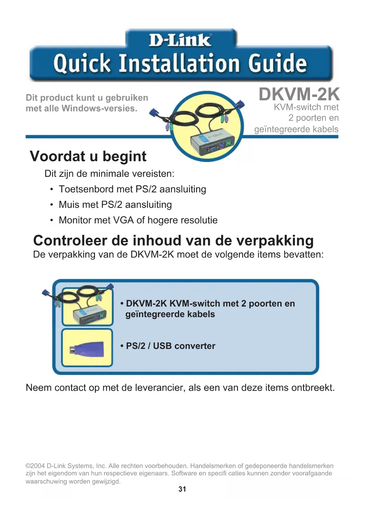 Telefono: 02-39607160 URL : http://www.dlink.it/supporto.html email: tech@dlink.it31 DKVM-2K KVM-switch met 2 poorten en geïntegreerde kabels Dit product kunt u gebruiken met alle Windows-versies. Controleer de inhoud van de verpakking De verpakking van de DKVM-2K moet de volgende items bevatten: Voordat u begint Dit zijn de minimale vereisten: