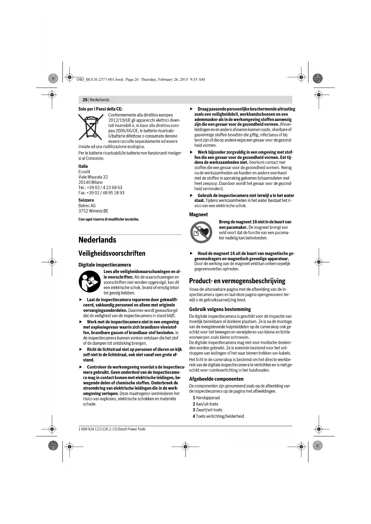 - Niet elk afgebeeld en beschreven toebehoren wordt standaard meegeleverd. Het volledige toebehoren vindt u in ons toebehoren- programma. Technische gegevens Montage Batterijen inzetten of vervangen Voor het gebruik van de inspectiecamera wordt het gebruik van alkali-mangaanbatterijen aanbevolen. Voor het openen van het batterijvakdeksel 12 drukt u op de vergrendeling 13 en klapt u het batterijvakdeksel 12 open. Trek het batterijvak 11 eruit en plaats de batterijen. Let er hierbij op dat de plus- en min-polen correct volgens de afbeel- ding op de binnenkant van het batterijvak 11 worden ge- plaatst. Schuif het batterijvak 11 tot de aanslag in en sluit het batterijvakdeksel 12. Bij een lage laadtoestand van de batterijen verschijnt eerst het symbool op het display. Wanneer het batterijsymbool leeg is, moet u de batterijen vervangen, inspecties zijn niet meer mogelijk. Vervang altijd alle batterijen tegelijkertijd. Gebruik alleen bat- terijen van één fabrikant en met dezelfde capaciteit. Haal de batterijen uit de inspectiecamera, wanneer u deze langere tijd niet gebruikt. De batterijen kunnen bij een langere periode van opslag corroderen en zichzelf ont- laden. Camerakabel monteren (zie afbeelding A) Voor het gebruik van de inspectiecamera moet de camer- akabel 7 op het handapparaat 1 gemonteerd worden. Steek de stekker van de camerakabel 7 in de juiste positie op de camera-aansluiting 14 tot deze vastklikt. Camerakabel demonteren (zie afbeeldingB) Voor het wegnemen van de camerakabel 7 drukt u de vergren- deling 15 bij elkaar en trekt u de stekker uit het handtoestel 1. Spiegel, magneet of haak monteren (zie afbeeldingC) De spiegel 18, de magneet 16 en de haak 17 kunnen als hulp- middel op de camerakop 8 worden gemonteerd. Schuif een van de drie hulpmiddelen zoals afgebeeld tot aan de aanslag op de uitsparing van de camerakop 8. Opmerking: De magneet 16 en de haak 17 zijn alleen ge- schikt voor het bewegen en verwijderen van loszittende klei- ne en lichte voorwerpen. Als er te hard wordt getrokken, kun- nen de inspectiecamera of het hulpmiddel beschadigd raken. Gebruik Bescherm het handtoestel 1 en de batterijen tegen nat- heid en directe bestraling door de zon. Camerakabel en camerakop zijn bij een correcte montage waterdicht. Het handtoestel en de batterijen zijn echter niet tegen water beschermd, bij contact met water bestaat het risico van een elektrische schok of beschadiging. Stel de inspectiecamera niet bloot aan extreme tempe- raturen of temperatuurschommelingen. Laat deze bij- voorbeeld niet lange tijd in de auto liggen. Laat de inspec- tiecamera bij grote temperatuurschommelingen eerst op de juiste temperatuur komen voordat u deze in gebruik neemt. Gebruik de inspectiecamera niet als de lens op de ca- merakop 8 beslagen is. Schakel de inspectiecamera pas in als het vocht verdampt is. De inspectiecamera kan anders beschadigd raken. De ingeschakelde lamp 9 kan tijdens gebruik heet wor- den. Raak de lamp niet aan om verbrandingen te vermij- den. Digitale inspectiecamera GIC 120 Productnummer 3 601 B41 1.. Nominale spanning V= 6,0 Bedrijfstemperatuur °C –10...+50 Opslagtemperatuur (handtoestel zonder batterijen) °C –20...+60 Relatieve luchtvochtigheid % 5–95