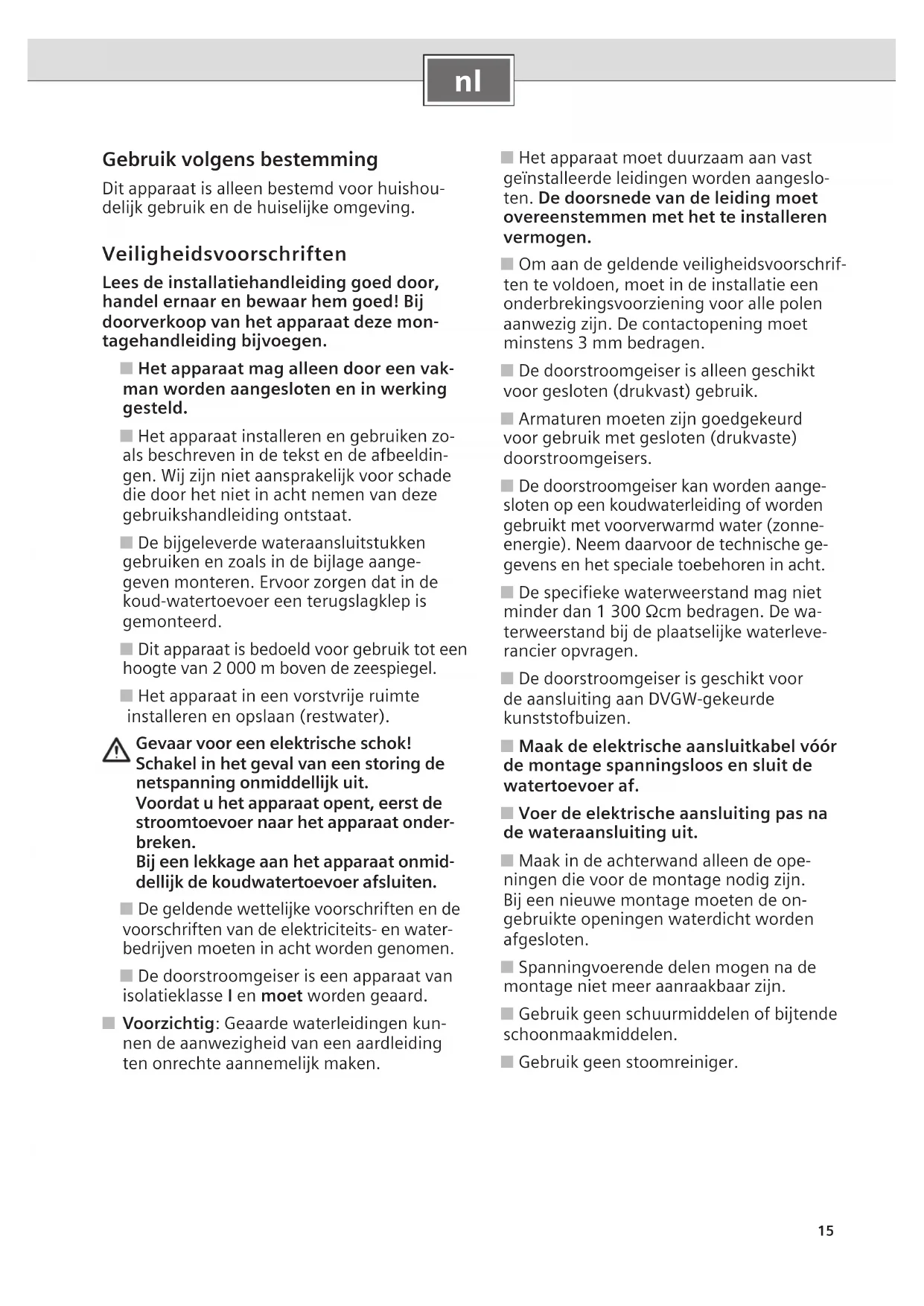 Gebruik volgens bestemming Dit apparaat is alleen bestemd voor huishou- delijk gebruik en de huiselijke omgeving. Veiligheidsvoorschriften Lees de installatiehandleiding goed door, handel ernaar en bewaar hem goed! Bij doorverkoop van het apparaat deze mon- tagehandleiding bijvoegen. ■ Het apparaat mag alleen door een vak- man worden aangesloten en in werking gesteld. ■ Het apparaat installeren en gebruiken zo- als beschreven in de tekst en de afbeeldin- gen. Wij zijn niet aansprakelijk voor schade die door het niet in acht nemen van deze gebruikshandleiding ontstaat. ■ De bijgeleverde wateraansluitstukken gebruiken en zoals in de bijlage aange- geven monteren. Ervoor zorgen dat in de koud-watertoevoer een terugslagklep is gemonteerd. ■ Dit apparaat is bedoeld voor gebruik tot een hoogte van 2 000 m boven de zeespiegel. ■ Het apparaat in een vorstvrije ruimte installeren en opslaan (restwater). Gevaar voor een elektrische schok! Schakel in het geval van een storing de netspanning onmiddellijk uit. Voordat u het apparaat opent, eerst de stroomtoevoer naar het apparaat onder- breken. Bij een lekkage aan het apparaat onmid- dellijk de koudwatertoevoer afsluiten. ■ De geldende wettelijke voorschriften en de voorschriften van de elektriciteits- en water- bedrijven moeten in acht worden genomen. ■ De doorstroomgeiser is een apparaat van isolatieklasse I en moet worden geaard. ■ Voorzichtig: Geaarde waterleidingen kun- nen de aanwezigheid van een aardleiding ten onrechte aannemelijk maken. ■ Het apparaat moet duurzaam aan vast geïnstalleerde leidingen worden aangeslo- ten. De doorsnede van de leiding moet overeenstemmen met het te installeren vermogen. ■ Om aan de geldende veiligheidsvoorschrif- ten te voldoen, moet in de installatie een onderbrekingsvoorziening voor alle polen aanwezig zijn. De contactopening moet minstens 3 mm bedragen. ■ De doorstroomgeiser is alleen geschikt voor gesloten (drukvast) gebruik. ■ Armaturen moeten zijn goedgekeurd voor gebruik met gesloten (drukvaste) doorstroomgeisers. ■ De doorstroomgeiser kan worden aange- sloten op een koudwaterleiding of worden gebruikt met voorverwarmd water (zonne- energie). Neem daarvoor de technische ge- gevens en het speciale toebehoren in acht. ■ De specifieke waterweerstand mag niet minder dan 1 300 Ωcm bedragen. De wa- terweerstand bij de plaatselijke waterleve- rancier opvragen. ■ De doorstroomgeiser is geschikt voor de aansluiting aan DVGW-gekeurde kunststofbuizen. ■ Maak de elektrische aansluitkabel vóór de montage spanningsloos en sluit de watertoevoer af. ■ Voer de elektrische aansluiting pas na de wateraansluiting uit. ■ Maak in de achterwand alleen de ope- ningen die voor de montage nodig zijn. Bij een nieuwe montage moeten de on- gebruikte openingen waterdicht worden afgesloten. ■ Spanningvoerende delen mogen na de montage niet meer aanraakbaar zijn. ■ Gebruik geen schuurmiddelen of bijtende schoonmaakmiddelen. ■ Gebruik geen stoomreiniger.16