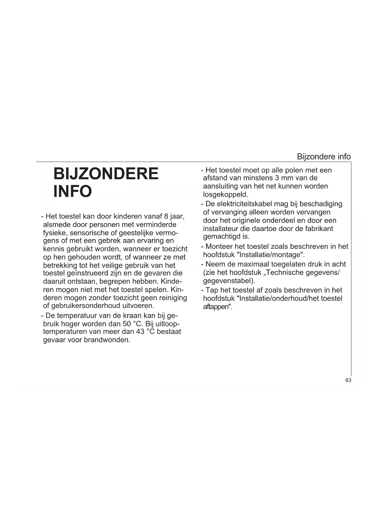 Bijzondere info BIJZONDERE INFO - Het toestel kan door kinderen vanaf 8 jaar, alsmede door personen met verminderde fysieke, sensorische of geestelijke vermo- gens of met een gebrek aan ervaring en kennis gebruikt worden, wanneer er toezicht op hen gehouden wordt, of wanneer ze met betrekking tot het veilige gebruik van het toestel geïnstrueerd zijn en de gevaren die daaruit ontstaan, begrepen hebben. Kinde- ren mogen niet met het toestel spelen. Kin- deren mogen zonder toezicht geen reiniging of gebruikersonderhoud uitvoeren. - De temperatuur van de kraan kan bij ge- bruik hoger worden dan 50 °C. Bij uitloop- temperaturen van meer dan 43 °C bestaat gevaar voor brandwonden. - Het toestel moet op alle polen met een afstand van minstens 3 mm van de aansluiting van het net kunnen worden losgekoppeld. - De elektriciteitskabel mag bij beschadiging of vervanging alleen worden vervangen door het originele onderdeel en door een installateur die daartoe door de fabrikant gemachtigd is. - Monteer het toestel zoals beschreven in het hoofdstuk "Installatie/montage". - Neem de maximaal toegelaten druk in acht (zie het hoofdstuk „Technische gegevens/ gegevenstabel). - Tap het toestel af zoals beschreven in het hoofdstuk "Installatie/onderhoud/het toestel aftappen".Bediening - voor de gebruiker en de installateur