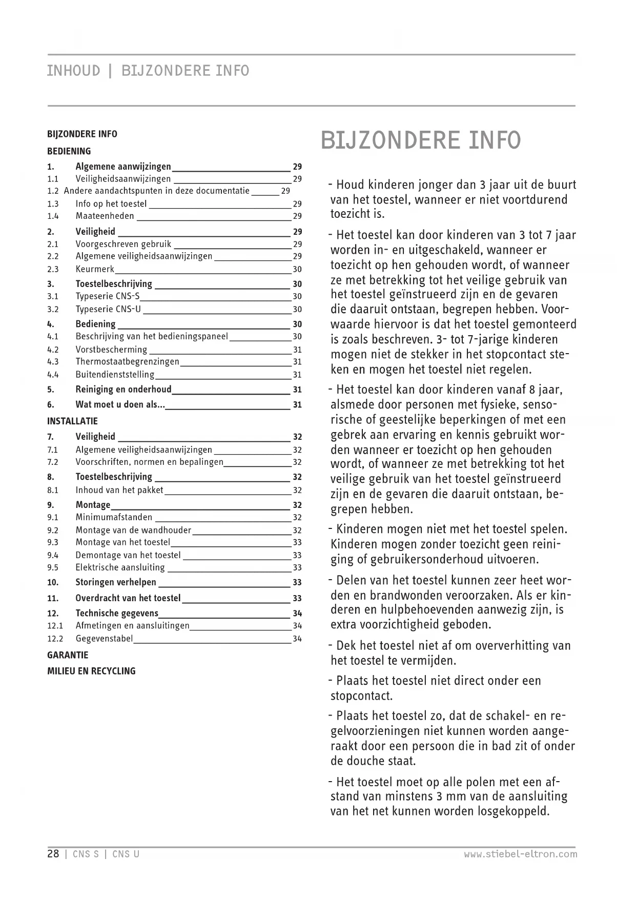 Garantie Les conditions de garantie de nos sociétés allemandes ne s’appliquent pas aux appareils achetés hors d’Allemagne. Au contraire, c’est la liale chargée de la distribution de nos pro- duits dans le pays qui est seule habilitée à accorder une garan- tie. Une telle garantie ne pourra cependant être accordée que si la liale a publié ses propres conditions de garantie. Il ne sera accordé aucune garantie par ailleurs. Nous n’accordons aucune garantie pour les appareils achetés dans des pays où aucune liale de notre société ne distribue nos produits. D’éventuelles garanties accordées par l’importa- teur restent inchangées. Environnement et recyclage Merci de contribuer à la préservation de notre environnement. Après usage, procédez à l’élimination des matériaux conformé- ment à la réglementation nationale.28 | CNS S | CNS U www.stiebel-eltron.com INHOUD | BzondeRe info BzondeRe info - Houd kinderen jonger dan 3 jaar uit de buurt van het toestel, wanneer er niet voortdurend toezicht is. - Het toestel kan door kinderen van 3 tot 7 jaar worden in- en uitgeschakeld, wanneer er toezicht op hen gehouden wordt, of wanneer ze met betrekking tot het veilige gebruik van het toestel geïnstrueerd zijn en de gevaren die daaruit ontstaan, begrepen hebben. Voor- waarde hiervoor is dat het toestel gemonteerd is zoals beschreven. 3- tot 7-jarige kinderen mogen niet de stekker in het stopcontact ste- ken en mogen het toestel niet regelen. - Het toestel kan door kinderen vanaf 8 jaar, alsmede door personen met fysieke, senso- rische of geestelijke beperkingen of met een gebrek aan ervaring en kennis gebruikt wor- den wanneer er toezicht op hen gehouden wordt, of wanneer ze met betrekking tot het veilige gebruik van het toestel geïnstrueerd zijn en de gevaren die daaruit ontstaan, be- grepen hebben. - Kinderen mogen niet met het toestel spelen. Kinderen mogen zonder toezicht geen reini- ging of gebruikersonderhoud uitvoeren. - Delen van het toestel kunnen zeer heet wor- den en brandwonden veroorzaken. Als er kin- deren en hulpbehoevenden aanwezig zijn, is extra voorzichtigheid geboden. - Dek het toestel niet af om oververhitting van het toestel te vermijden. - Plaats het toestel niet direct onder een stopcontact. - Plaats het toestel zo, dat de schakel- en re- gelvoorzieningen niet kunnen worden aange- raakt door een persoon die in bad zit of onder de douche staat. - Het toestel moet op alle polen met een af- stand van minstens 3mm van de aansluiting van het net kunnen worden losgekoppeld. BIJZONDERE INFOBEDIENING