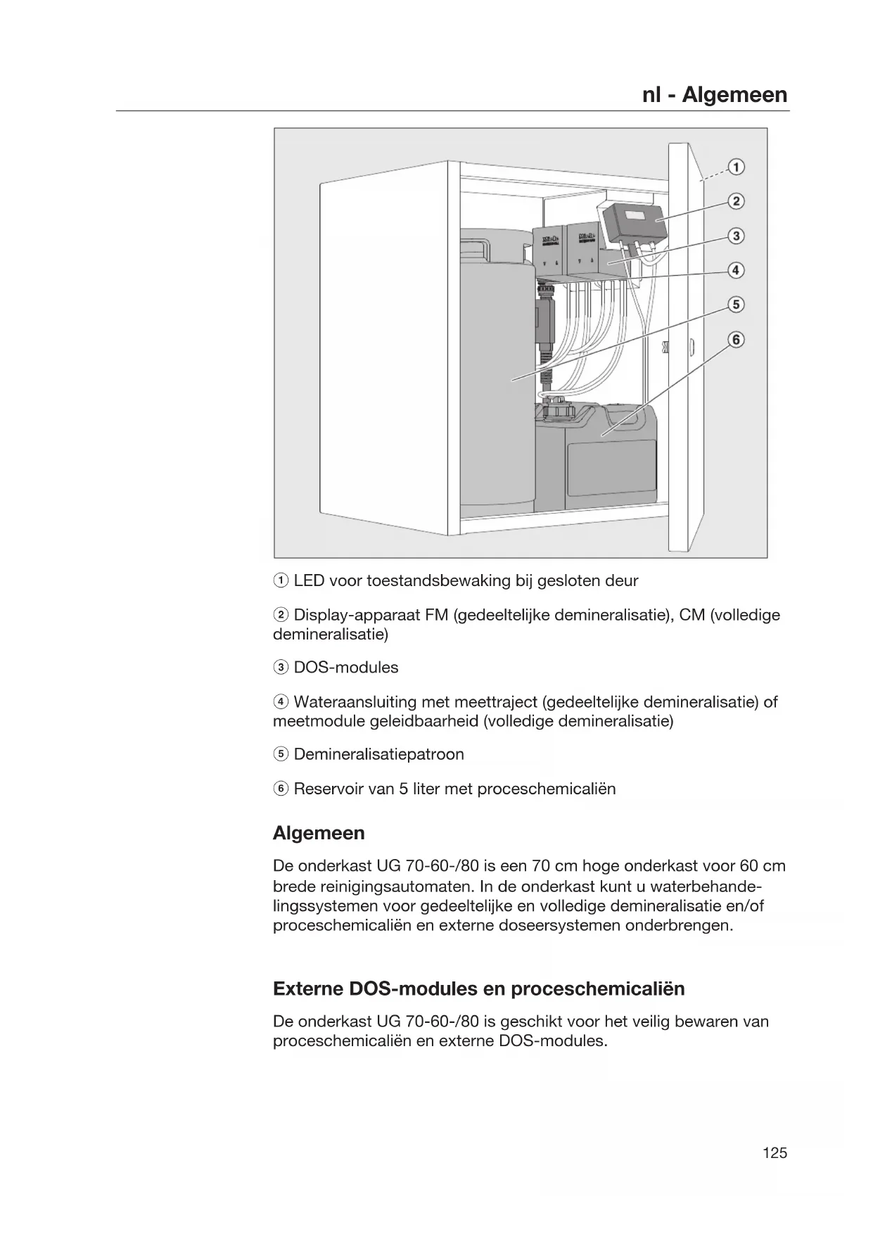 LED voor toestandsbewaking bij gesloten deur Display-apparaat FM (gedeeltelijke demineralisatie), CM (volledige demineralisatie) DOS-modules Wateraansluiting met meettraject (gedeeltelijke demineralisatie) of meetmodule geleidbaarheid (volledige demineralisatie) Demineralisatiepatroon Reservoir van 5 liter met proceschemicaliën Algemeen De onderkast UG 70-60-/80 is een 70 cm hoge onderkast voor 60 cm brede reinigingsautomaten. In de onderkast kunt u waterbehande- lingssystemen voor gedeeltelijke en volledige demineralisatie en/of proceschemicaliën en externe doseersystemen onderbrengen. Externe DOS-modules en proceschemicaliën De onderkast UG 70-60-/80 is geschikt voor het veilig bewaren van proceschemicaliën en externe DOS-modules.nl - Algemeen