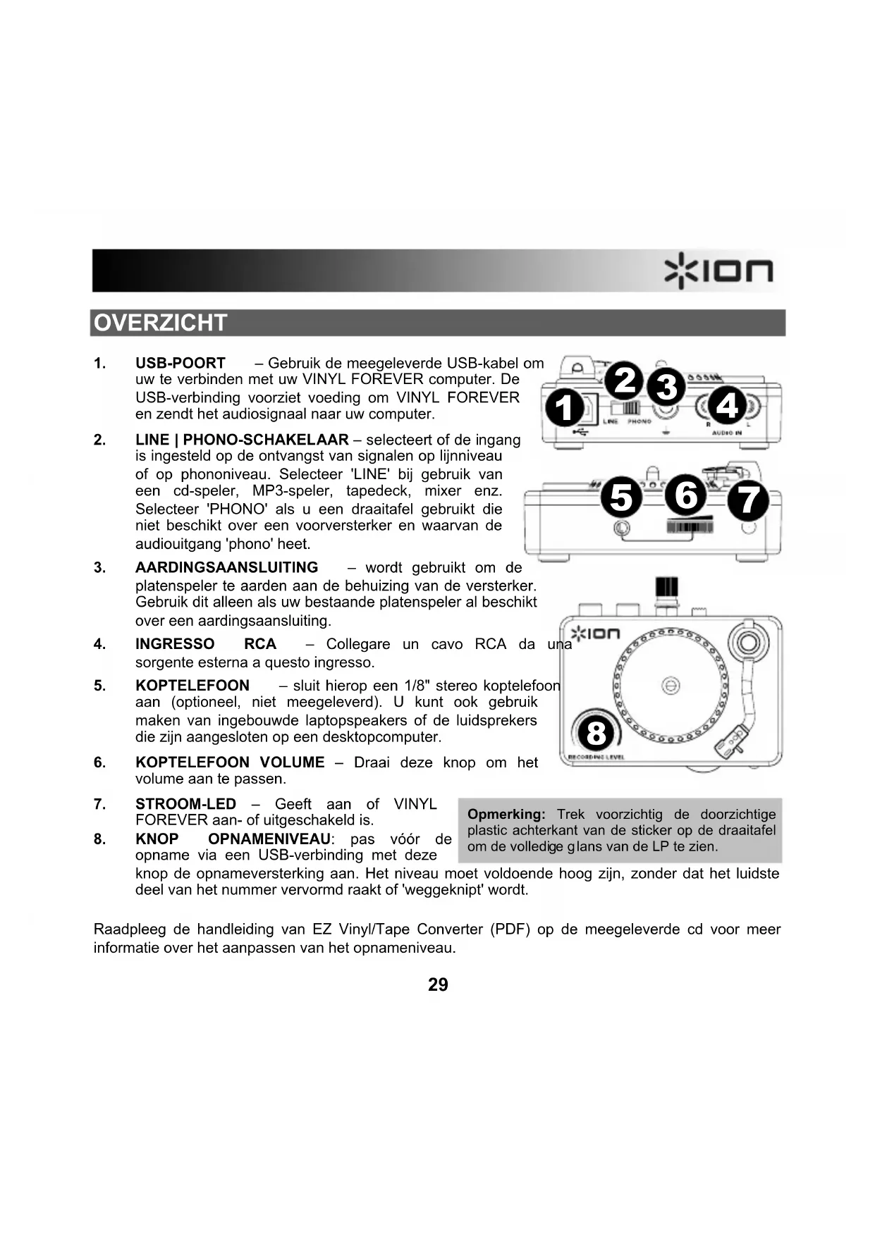 - Veiligheids- en garantie-informatie LEES DE VEILIGHEIDSINSTRUCTIES VOOR HET PRODUCT GEBRUIKT WORDT Bezoek http://www.ionaudio.com voor productregistratie. INTRODUCTIE Wanneer u wilt genieten van de voordelen van opname naar een PC, u moet de EZ Vinyl/Tape Converter-Software installeren. EZ Vinyl/Tape Converter is de snelste en makkelijkste manier om uw opnamen om te zetten in digitale media. EZ Vinyl/Tape Converter bewaart uw opnamen voor uw gemak in uw iTunes-bibliotheek. Om de software te installeren kunt u eenvoudig de meegeleverde CD in de hiervoor geschikte drive op uw computer invoeren waarna u de instructies op het scherm volgt. Na conversie van uw platen kunt u de opnamen op CD branden of op draagbare media-apparatuur laden. Bezoek www.ionaudio.com/computer-optimization voor meer informatie over het optimaliseren van uw computer voor geluidsfunctionaliteit. Surf naar www.ionaudio.com/ezvc om de laatste versie te downloaden van EZ Vinyl/Tape Converter en voor een handige probleemoplossingsgidsen en bijkomende ondersteuning. Opmerking: Trek voorzichtig de doorzichtige plastic achterkant van de sticker op de draaitafel om de volledige glans van de LP te zien. Zie de handleiding van EZ Vinyl/Tape Converter (PDF) op de meegeleverde cd voor meer informatie over het opnemen met de software.28