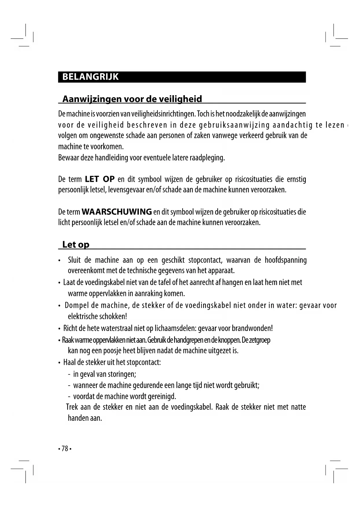 - Raak warme oppervlakken niet aan. Gebruik de handgrepen en de knoppen. De zetgroep kan nog een poosje heet blijven nadat de machine uitgezet is.