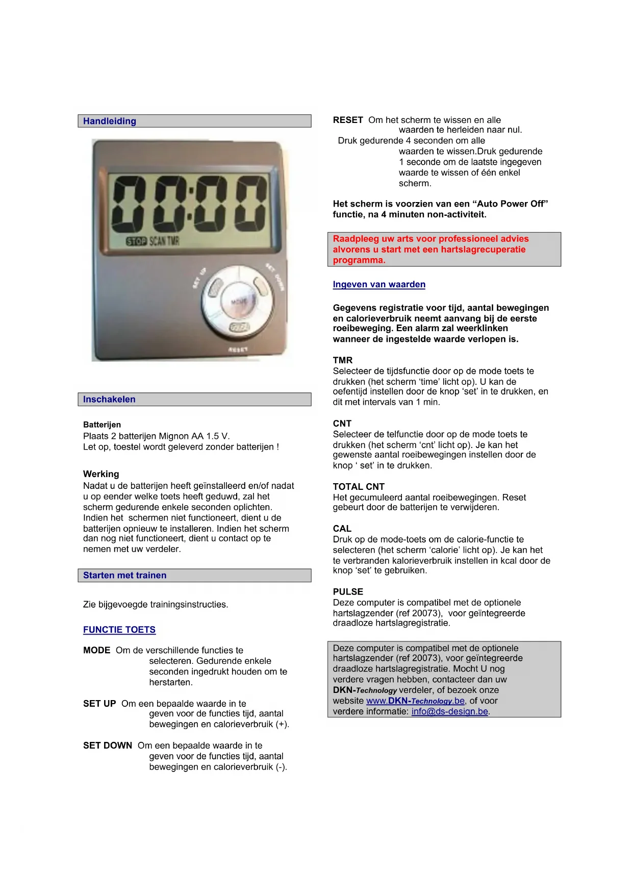 Deze computer is compatibel met de optionele hartslagzender (ref 20073), voor geinteggreerde draadloze hartslagregistratie. Mocht U nog verdere vragen hebben, contacteer dan uw DKN-Technology verdeler, of bezoek once website www.DKN-Technology.be, of voor verdere informatie: info@ds-design.be.
