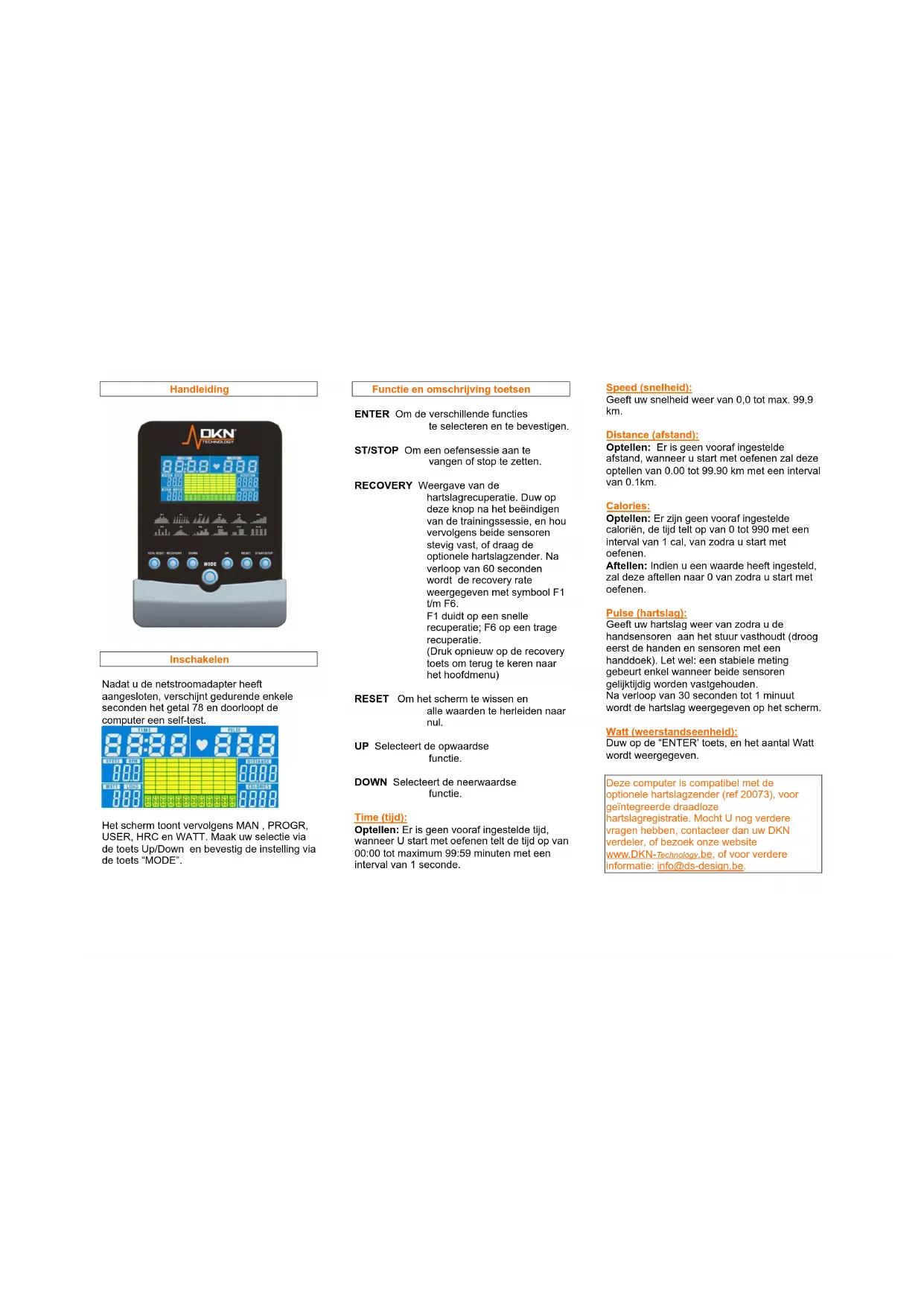 Deze computer is compatibel met de optionele hartslagzender (ref 20073), voor geïntegreerde draadloze hartslagregistratie. Mocht U nog verdere vragen hebben, contacteer dan uw DKN verdeler, of bezoek onze website www.DKN-Technology.be, of voor verdere informatie: info@ds-design.be