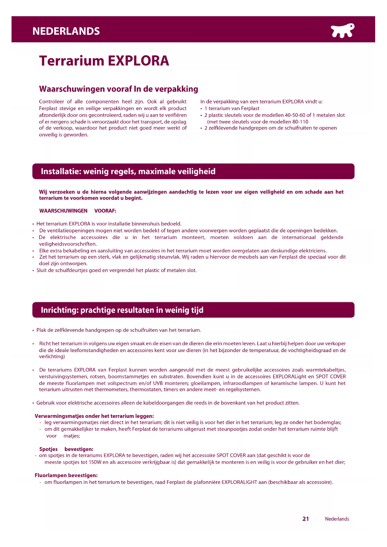 EXPLORALIGHT 15 W / T8EXPLORALIGHT 18 W / T8EXPLORALIGHT 30 W / T8EXPLORA 40EXPLORA 50EXPLORA 60EXPLORA 80EXPLORA 80 HEXPLORA 110EXPLORA 110 H21 Nederlands NEDERLANDS Terrarium EXPLORA Controleer of alle componenten heel zijn. Ook al gebruikt Ferplast stevige en veilige verpakkingen en wordt elk product afzonderlijk door ons gecontroleerd, raden wij u aan te verifiëren of er nergens schade is veroorzaakt door het transport, de opslag of de verkoop, waardoor het product niet goed meer werkt of onveilig is geworden. Waarschuwingen vooraf In de verpakking In de verpakking van een terrarium EXPLORA vindt u: