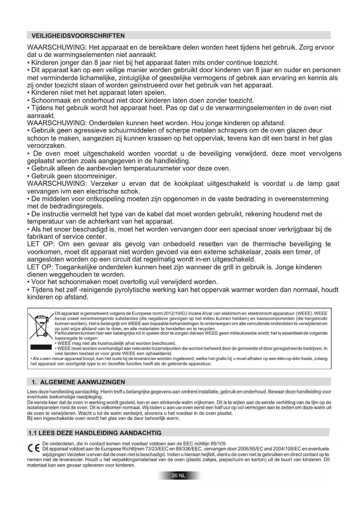 Lees deze handleiding aandachtig. Hierin treff u betangrijke gegevens aan omtrent installatie, gebruik en onderhoud. Bewaar deze handleiding voor eventuele toekomstige raadpleging. De eerste keer dat de oven in werking wordt gesteld, kan er een stinkende walm vrijkomen. Dit is te wijten aan de eerste verhitting van de lijm op de isolatiepanelen rond de oven. Dit is volkomen normaal. Wij raden u aan uw oven eerst een half uur op vol vermogen aan te zetten om deze walm uit de oven te verwijderen. Wacht u tot de walm verdwijnt, alvorens u het voedsel in de oven plaatst. Bij een ingeschakelde oven wordt het glas van de deur behoorlijk warm. De onderdelen, die in contact komen met voedsel voldoen aan de EEC richtlijn 89/109. Dit apparaat voldoet aan de Europese Richtlijnen 73/23/EEC en 89/336/EEC, vervangen door 2006/95/EC and 2004/108/EC en eventuele wijzigingen Verzeker u ervan dat de oven niet is beschadigd. Indien u hieraan twijfelt, dient u de oven niet te gebruiken en direct contact op te nemen met de leverancier. Houdt u het verpakkingsmateriaal van de oven (plastic zakjes, piepschuim en karton) uit de buurt van kinderen. Dit materiaal kan een gevaar opleveren voor kinderen.