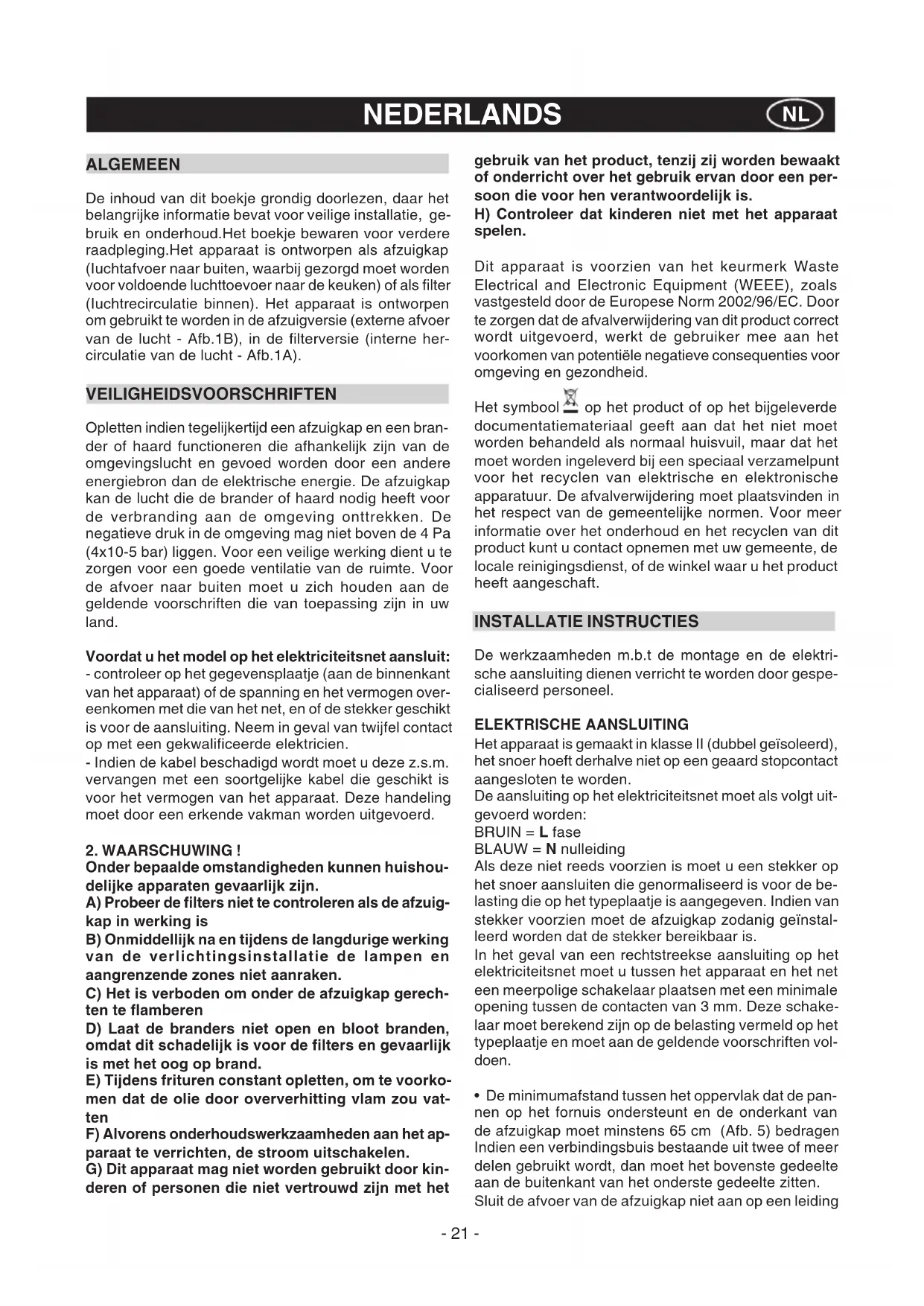 ALGEMEEN De inhoud van dit boekje grondig doorlezen, daar het belangrijke informatie bevat voor veilige installatie, ge- bruik en onderhoud.Het boekje bewaren voor verdere raadpleging.Het apparaat is ontworpen als afzuigkap (Iuchtafvoer naar buiten, waarbij gezorgd moet worden voor voldoende luchttoevoer naar de keuken) of als filter (Iuchtrecirculatie binnen). Het apparaat is ontworpen om gebruikt te worden in de afzuigversie (externe afvoer van de lucht - Afb.1B), in de filterversie (interne her- circulatie van de lucht - Afb.1A). VEILIGHEIDSVOORSCHRIFTEN Opletten indien tegelijkertijd een afzuigkap en een bran- der of haard functioneren die afhankelijk zijn van de omgevingslucht en gevoed worden door een andere energiebron dan de elektrische energie. De afzuigkap kan de lucht die de brander of haard nodig heeft voor de verbranding aan de omgeving onttrekken. De negatieve druk in de omgeving mag niet boven de 4 Pa (4x10-5 bar) liggen. Voor een veilige werking dient u te zorgen voor een goede ventilatie van de ruimte. Voor de afvoer naar buiten moet u zich houden aan de geldende voorschriften die van toepassing zijn in uw land. Voordat u het model op het elektriciteitsnet aansluit: - controleer op het gegevensplaatje (aan de binnenkant van het apparaat) of de spanning en het vermogen over- eenkomen met die van het net, en of de stekker geschikt is voor de aansluiting. Neem in geval van twijfel contact op met een gekwalificeerde elektricien. - Indien de kabel beschadigd wordt moet u deze z.s.m. vervangen met een soortgelijke kabel die geschikt is voor het vermogen van het apparaat. Deze handeling moet door een erkende vakman worden uitgevoerd.