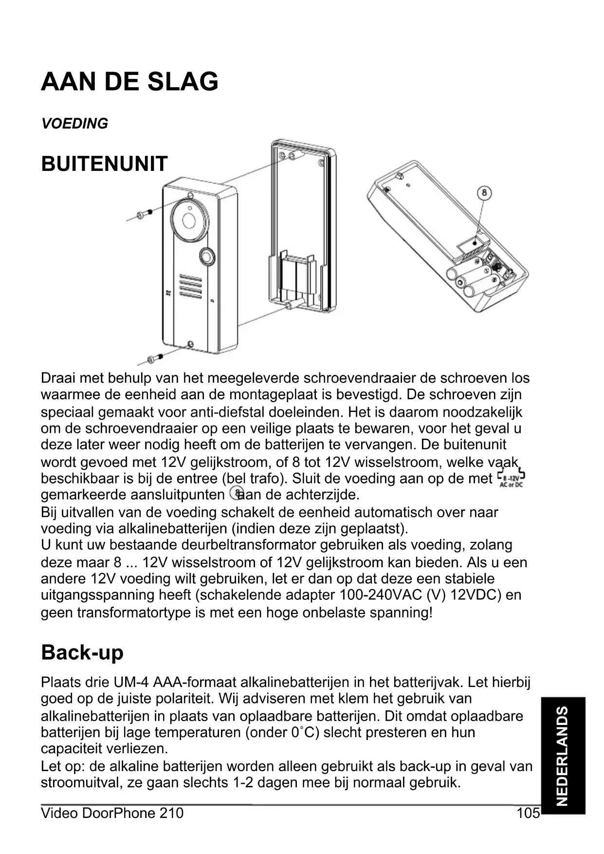 Draai met behulp van het meegeleverde schroevendraaier de schroeven los waarmee de eenheid aan de montageplaat is bevestigd. De schroeven zijn speciaal gemaakt voor anti-diefstal doeleinden. Het is daarom noodzakelijk om de schroevendraaier op een veilige plaats te bewaren, voor het geval u deze later weer nodig heeft om de batterijen te vervangen. De buitenunit wordt gevoed met 12V gelijkstroom, of 8 tot 12V wisselstroom, welke vaak beschikbaar is bij de entree (bel trafo). Sluit de voeding aan op de met gemarkeerde aansluitpunten aan de achterzijde. Bij uitvallen van de voeding schakelt de eenheid automatisch over naar voeding via alkalinebatterijen (indien deze zijn geplaatst). U kunt uw bestaande deurbeltransformator gebruiken als voeding, zolang deze maar 8 ... 12V wisselstroom of 12V gelijkstroom kan bieden. Als u een andere 12V voeding wilt gebruiken, let er dan op dat deze een stabiele uitgangsspanning heeft (schakelende adapter 100-240VAC (V) 12VDC) en geen transformatortype is met een hoge onbelaste spanning! Back-up Plaats drie UM-4 AAA-formaat alkalinebatterijen in het batterijvak. Let hierbij goed op de juiste polariteit. Wij adviseren met klem het gebruik van alkalinebatterijen in plaats van oplaadbare batterijen. Dit omdat oplaadbare batterijen bij lage temperaturen (onder 0˚C) slecht presteren en hun capaciteit verliezen. Let op: de alkaline batterijen worden alleen gebruikt als back-up in geval van stroomuitval, ze gaan slechts 1-2 dagen mee bij normaal gebruik.© MARMITEK