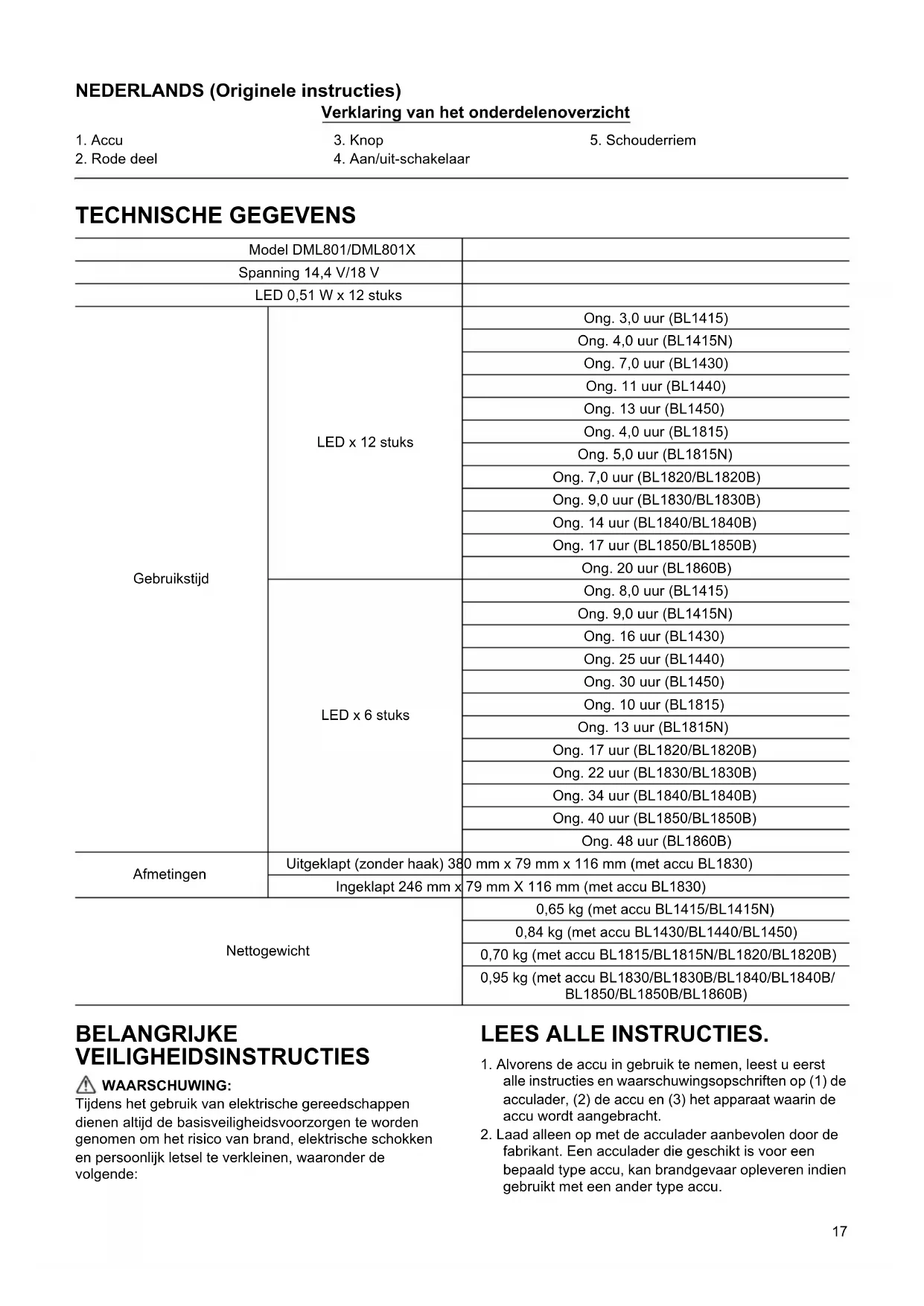 - Sommige items op de lijst kunnen zijn inbegrepen in de doos van het gereedschap als standaard toebehoren. Zij kunnen van land tot land verschillen. Werking van de aan/ uit-schakelaar Status van de lamp 1e keer drukken Alle LED’s branden. 2e keer drukken Slechts 6 LED’s branden. 3e keer drukken Alle LED’s zijn uit.20 ESPAÑOL (Instrucciones originales) Explicación de los dibujos ESPECIFICACIONES INSTRUCCIONES IMPORTANTES DE SEGURIDAD ADVERTENCIA: Cuando se utilicen herramientas eléctricas siempre deben seguirse precauciones de seguridad para reducir el riesgo de fuego, descargas eléctricas y lesiones personales, incluyendo las siguientes: