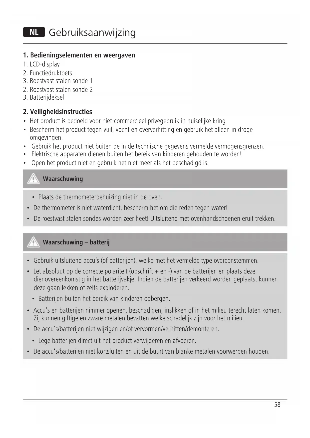 - De roestvast stalen sondes worden zeer heet! Uitsluitend met ovenhandschoenen eruit trekken. Waarschuwing – batterij