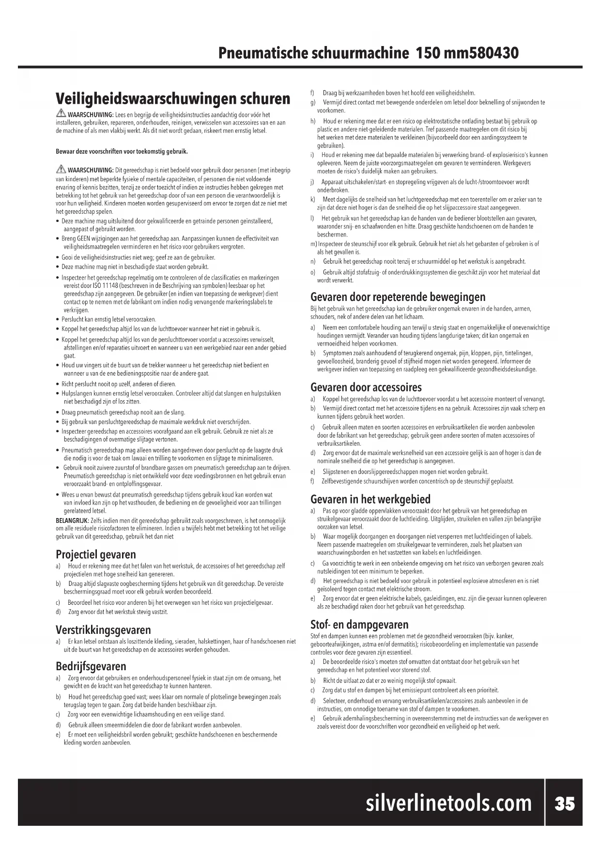 silverlinetools.com Veiligheidswaarschuwingen schuren WAARSCHUWING: Leesenbegrijpdeveiligheidsinstructiesaandachtigdoorvóórhet installeren,gebruiken,repareren,onderhouden,reinigen,verwisselenvanaccessoiresvanenaandemachineofalsmenvlakbijwerkt.Alsditnietwordtgedaan,riskeertmenernstigletsel.Bewaar deze voorschriften voor toekomstig gebruik. WAARSCHUWING: Ditgereedschapisnietbedoeldvoorgebruikdoorpersonen(metinbegrip vankinderen)metbeperktefysiekeofmentalecapaciteiten,ofpersonendienietvoldoendeervaringofkennisbezitten,tenzijzeondertoezichtofindienzeinstructieshebbengekregenmetbetrekkingtothetgebruikvanhetgereedschapdoorofvaneenpersoondieverantwoordelijkisvoorhunveiligheid.Kinderenmoetenwordengesuperviseerdomervoortezorgendatzenietmethetgereedschapspelen.• Dezemachinemaguitsluitenddoorgekwaliceerdeengetraindepersonengeïnstalleerd,aangepastofgebruiktworden.• BrengGEENwijzigingenaanhetgereedschapaan.Aanpassingenkunnendeeffectiviteitvanveiligheidsmaatregelenverminderenenhetrisicovoorgebruikersvergroten.• Gooideveiligheidsinstructiesnietweg;geefzeaandegebruiker.• Dezemachinemagnietinbeschadigdestaatwordengebruikt.• InspecteerhetgereedschapregelmatigomtecontrolerenofdeclassicatiesenmarkeringenvereistdoorISO11148(beschrevenindeBeschrijvingvansymbolen)leesbaarophetgereedschapzijnaangegeven.Degebruiker(enindienvantoepassingdewerkgever)dientcontactoptenemenmetdefabrikantomindiennodigvervangendemarkeringslabelsteverkrijgen.• Persluchtkanernstigletselveroorzaken.• Koppelhetgereedschapaltijdlosvandeluchttoevoerwanneerhetnietingebruikis.• Koppelhetgereedschapaltijdlosvandepersluchttoevoervoordatuaccessoiresverwisselt,afstellingenen/ofreparatiesuitvoertenwanneeruvaneenwerkgebiednaareenandergebiedgaat.• Houduwvingersuitdebuurtvandetrekkerwanneeruhetgereedschapnietbedientenwanneeruvandeenebedieningspositienaardeanderegaat.• Richtpersluchtnooitopuzelf,anderenofdieren.• Hulpslangenkunnenernstigletselveroorzaken.Controleeraltijddatslangenenhulpstukkennietbeschadigdzijnofloszitten.• Draagpneumatischgereedschapnooitaandeslang.• Bijgebruikvanpersluchtgereedschapdemaximalewerkdruknietoverschrijden.• Inspecteergereedschapenaccessoiresvoorafgaandaanelkgebruik.Gebruikzenietalszebeschadigingenofovermatigeslijtagevertonen.• Pneumatischgereedschapmagalleenwordenaangedrevendoorpersluchtopdelaagstedrukdienodigisvoordetaakomlawaaientrillingtevoorkomenenslijtageteminimaliseren.