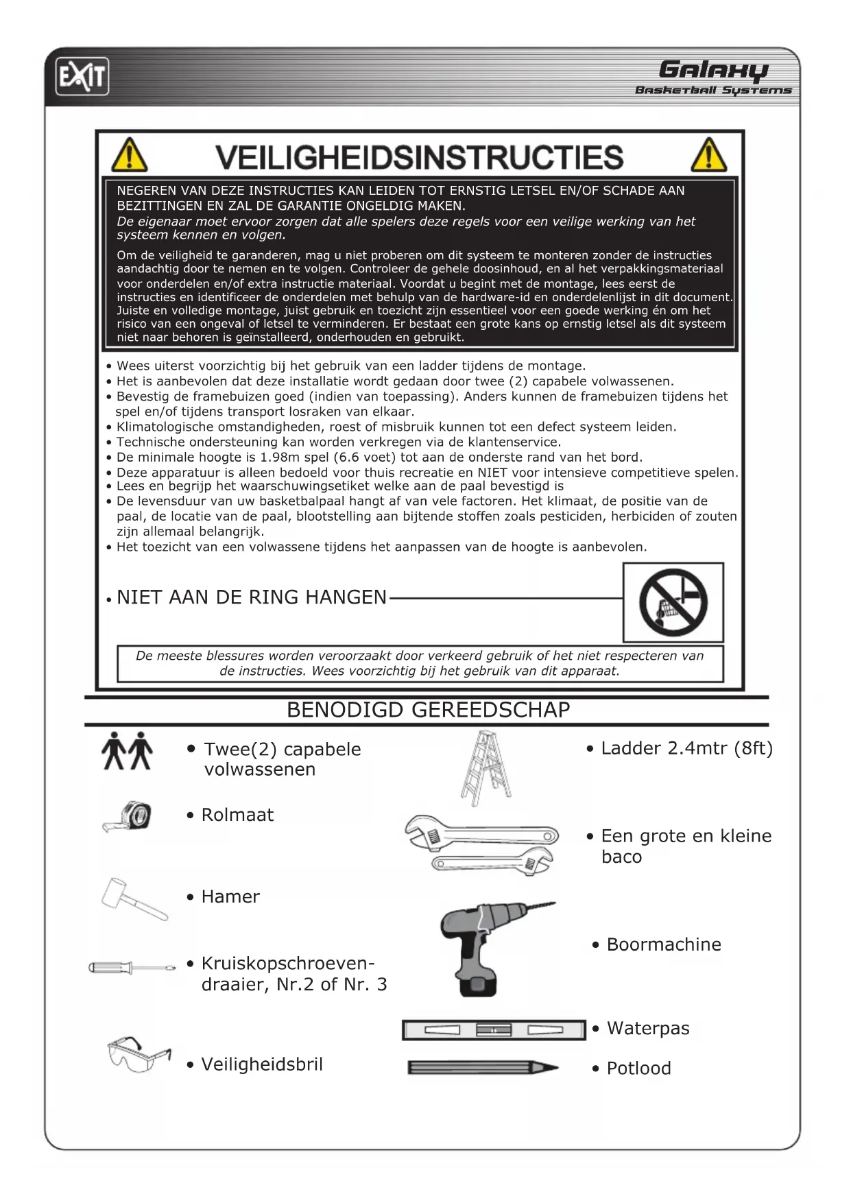 Voor alle EXIT Galaxy basketbalsystemen inclusief de Showroommodellen geldt dat ze gemonteerd dienen te worden volgens de instructies. Voorkom ERNSTIGE VERWONDINGEN en houd u aan de voorschriften. De meeste ernstige verwondingen komen voortuit onjuist gebruik en/of het Niet naleven van de voorschriften. Wees voorzichtig bij het gebruik van dit frame.