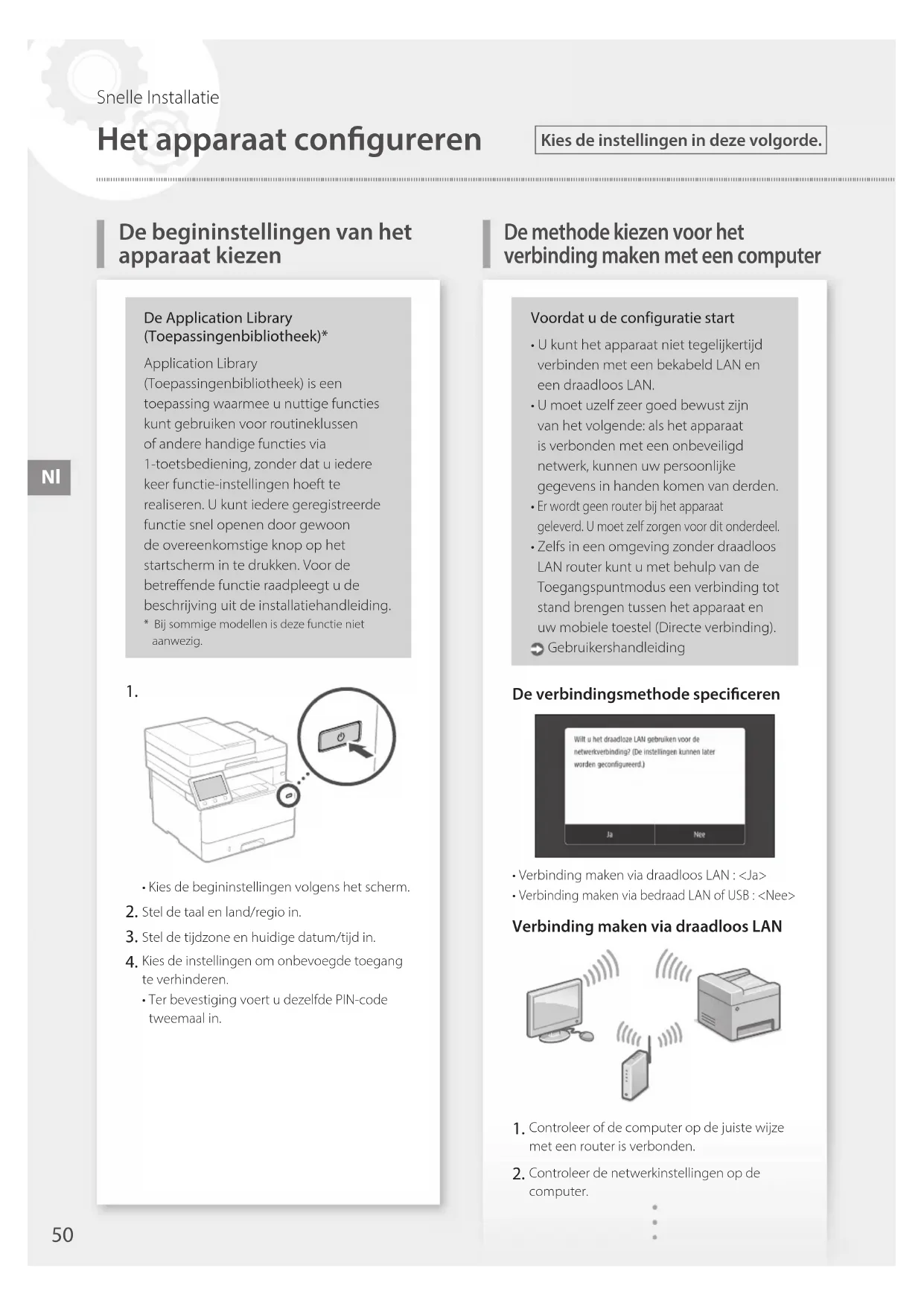 - Kies de begininstellingen volgens het scherm. Stel de taal en land/regio in. Stel de tijdzone en huidige datum/tijd in. Kies de instellingen om onbevoegde toegang te verhinderen.• Ter bevestiging voert u dezelfde PIN-code tweemaal in.Voordat u de configuratie start• U kunt het apparaat niet tegelijkertijd verbinden met een bekabeld LAN en een draadloos LAN. U moet uzelf zeer goed bewust zijn van het volgende: als het apparaat is verbonden met een onbeveiligd netwerk, kunnen uw persoonlijke gegevens in handen komen van derden. Er wordt geen router bij het apparaat geleverd.U moet zelf zorgen voor dit onderdeel. Zelfs in een omgeving zonder draadloos LAN router kunt u met behulp van de Toegangspuntmodus een verbinding tot stand brengen tussen het apparaat en uw mobiele toestel (Directe verbinding). GebruikershandleidingDe verbindingsmethode speciceren• Verbinding maken via draadloos LAN : <Ja> Verbinding maken via bedraad LAN of USB : <Nee>Verbinding maken via draadloos LAN Controleer of de computer op de juiste wijze met een router is verbonden. Controleer de netwerkinstellingen op de computer.