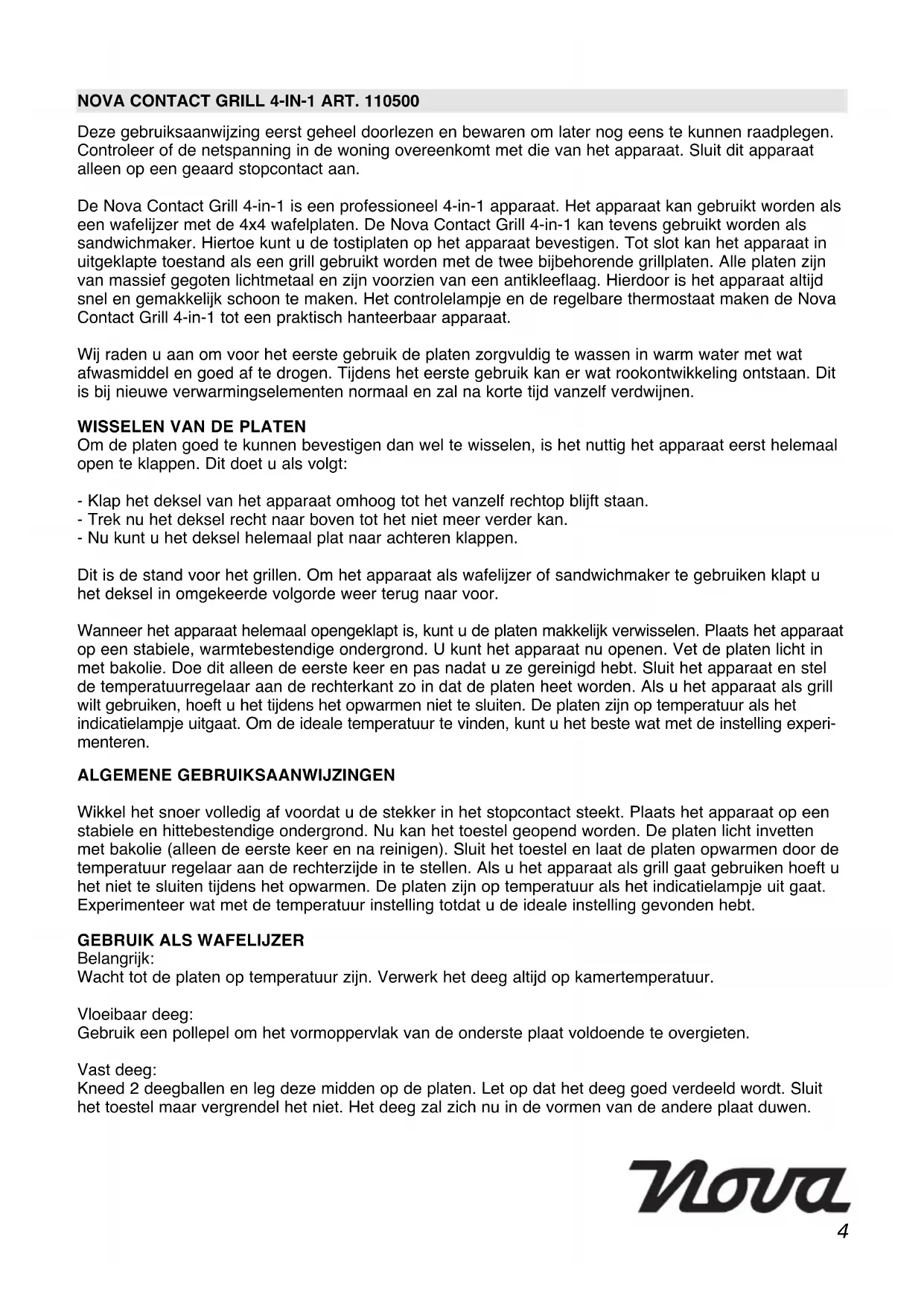 Deze gebruiksaanwijzing eerst geheel doorlezen en bewaren om later nog eens te kunnen raadplegen. Controleer of de netspanning in de woning overeenkomt met die van het apparaat. Sluit dit apparaat alleen op een geaard stopcontact aan. De Nova Contact Grill 4-in-1 is een professioneel 4-in-1 apparaat. Het apparaat kan gebruikt worden als een wafelijzer met de 4x4 wafelplaten. De Nova Contact Grill 4-in-1 kan tevens gebruikt worden als sandwichmaker. Hiertoe kunt u de tostiplaten op het apparaat bevestigen. Tot slot kan het apparaat in uitgeklapte toestand als een grill gebruikt worden met de twee bijbehorende grillplaten. Alle platen zijn van massief gegoten lichtmetaal en zijn voorzien van een antikleeflaag. Hierdoor is het apparaat altijd snel en gemakkelijk schoon te maken. Het controlelampje en de regelbare thermostaat maken de Nova Contact Grill 4-in-1 tot een praktisch hanteerbaar apparaat. Wij raden u aan om voor het eerste gebruik de platen zorgvuldig te wassen in warm water met wat afwasmiddel en goed af te drogen. Tijdens het eerste gebruik kan er wat rookontwikkeling ontstaan. Dit is bij nieuwe verwarmingselementen normaal en zal na korte tijd vanzelf verdwijnen.
