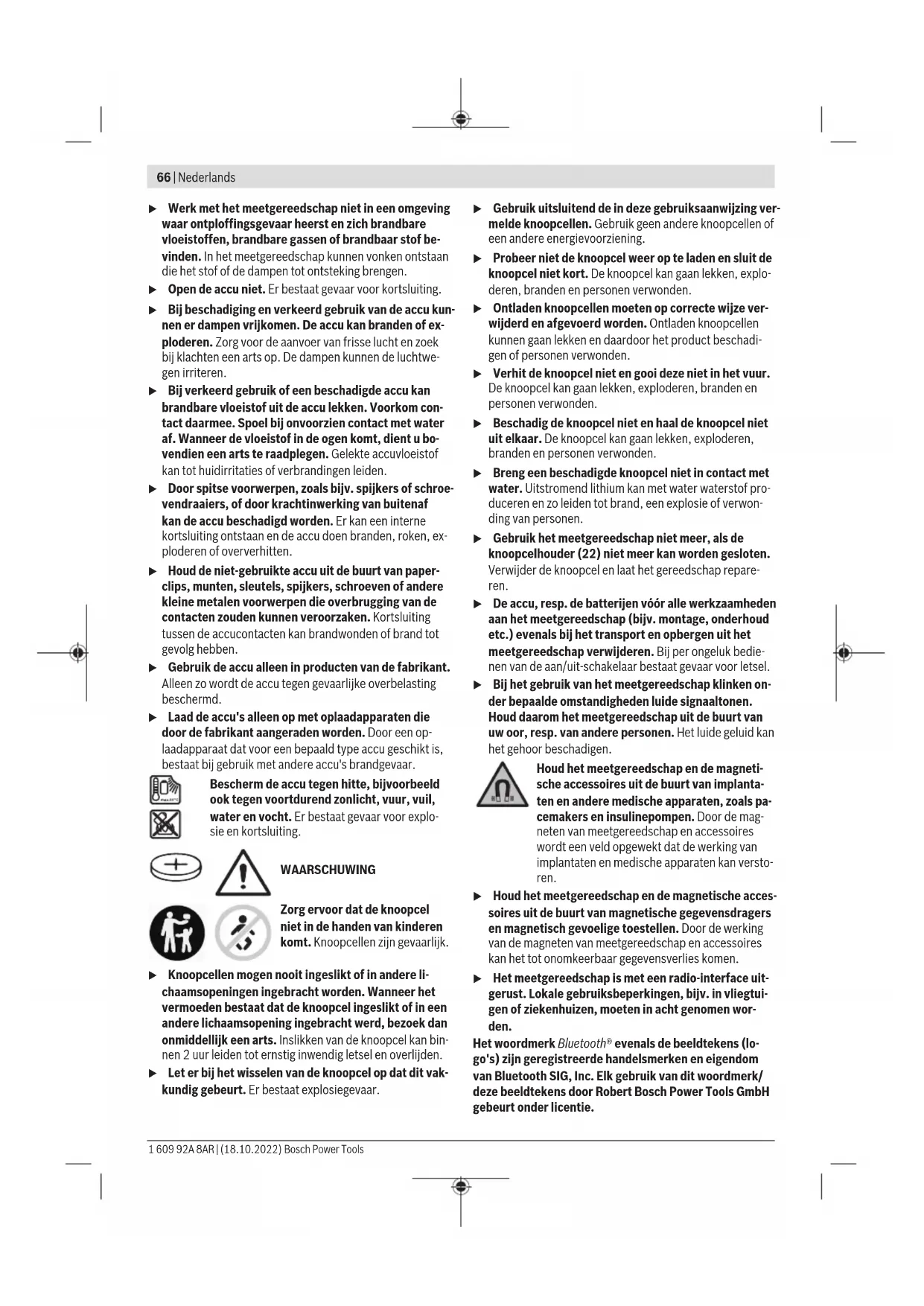 Het productnummer (18) op het typeplaatje dient voor een ondubbelzinnige identificatie van uw meetgereedschap. Montage Energievoorziening meetgereedschap Het meetgereedschap kan met in de handel verkrijgbare bat- terijen of met een Bosch lithiumionaccu worden gebruikt. Gebruik met accu u Gebruik alleen de in de technische gegevens vermelde oplaadapparaten. Alleen deze oplaadapparaten zijn af- gestemd op de Li-Ion-accu die bij uw meetgereedschap moet worden gebruikt. Aanwijzing: lithium-ion-accu's worden vanwege internatio- nale transportvoorschriften gedeeltelijk geladen geleverd. Om het volledige vermogen van de accu te waarborgen, laadt u vóór het eerste gebruik de accu volledig op. Voor het plaatsen van de geladen accu (15) deze in de ac- cuschacht (10) schuiven, tot deze voelbaar vergrendelt. Voor het verwijderen van de accu (15) op de ontgrende- lingsknoppen (13) drukken en de accu uit de accuschacht (10) trekken. Gebruik daarbij geen geweld. Gebruik met batterijen Voor het gebruik van het meetgereedschap wordt het ge- bruik van alkali-mangaanbatterijen aanbevolen. De batterijen worden in de batterij-adapter geplaatst. u De batterij-adapter is uitsluitend bedoeld voor het ge- bruik in de betreffende Bosch-meetgereedschappen en mag niet bij elektrische gereedschappen worden gebruikt. Voor het plaatsen van de batterijen de huls (11) van de bat- terijadapter in de accuschacht (10) schuiven. Plaats de bat- terijen volgens de afbeelding op de afsluitkap (14) in de huls. Schuif de afsluitkap over de huls tot deze voelbaar vastklikt. Voor het verwijderen van de batterijen (12) drukken op de ontgrendelingsknoppen (13) van de afsluitkap (14) en de afsluitkap eraf tre- ken. Let er hierbij op dat de batterijen er niet uitvallen. Hierbij het meetgereedschap met de accuschacht (10) naar boven gericht houden. Verwijder de batterijen. Om de binnenliggende huls (11) uit de accuschacht te verwijderen, de huls vastpakken en deze met een lichte druk op de zijwand uit het meetgereedschap trekken. Vervang altijd alle batterijen tegelijk. Gebruik alleen batterij- en van één fabrikant en met dezelfde capaciteit. u Haal de batterijen uit het meetgereedschap, wanneer u dit langere tijd niet gebruikt. De batterijen kunnen bij een langere periode van opslag in het meetgereedschap corroderen en zichzelf ontladen. Oplaadindicatie De oplaadaanduiding (2) geeft de laadtoestand van de accu of van de batterijen aan: LED Oplaadtoestand Permanent licht groen 100–75% Permanent licht geel 75–35% Permanent licht rood 35–10% Geen licht – Accu defect – Batterijen leeg Als de accu of de batterijen zwak worden, dan wordt de hel- derheid van de laserlijnen langzaam minder. Verwissel een defecte accu of lege batterijen onmiddellijk. Knoopcel vervangen (zieafbeeldingA) Het meetgereedschap is uitgerust met een knoopcel(21), zodat datum en tijd voor de functie CAL guard ook zonder geplaatste accu of geplaatste batterijen kunnen worden op- geslagen. Om de knoopcel te vervangen, verwijdert u de accu of de complete batterijadapter. Trek de knoopcelhouder(22) uit de knoopcelschacht(23). Verwijder de lege knoopcel(21) en plaats een nieuwe Bosch Power Tools 1 609 92A 8AR | (18.10.2022)70 | Nederlands knoopcel. Let er hierbij op dat de polen juist worden ge- plaatst volgens de afbeelding op de knoopcelhouder (de pluspool van de knoopcel moet naar boven wijzen). Schuif de knoopcelhouder(22) met geplaatste knoopcel in de schacht(23). Let erop dat de knoopcelhouder correct en volledig is ingeschoven, omdat anders de bescherming te- gen stof en spatwater niet meer gewaarborgd is. Verwijder vóór de eerste ingebruikname de beschermfolie van de knoopcel (21). Ga hiervoor te werk zoals bij het ver- vangen van de knoopcel. Gebruik Ingebruikname u Bescherm het meetgereedschap tegen vocht en fel zonlicht. u Stel het meetgereedschap niet bloot aan extreme tem- peraturen of temperatuurschommelingen. Laat het bijv. niet gedurende langere tijd in de auto liggen. Laat het meetgereedschap bij grotere temperatuurschommelin- gen eerst op temperatuur komen en voer vóór het verder werken altijd een nauwkeurigheidscontrole uit (zie „Mauwkeurigheidscontrole van het meetgereedschap“, Pagina72). Bij extreme temperaturen of temperatuurschommelingen kan de nauwkeurigheid van het meetgereedschap nadelig beïnvloed worden. u Vermijd krachtige stoten of vallen van het meetge- reedschap. Na sterke invloeden van buitenaf op het meetgereedschap, moet u altijd vóór het opnieuw gebrui- ken hiervan een nauwkeurigheidscontrole uitvoeren (zie „Mauwkeurigheidscontrole van het meetgereedschap“, Pagina72). u Het meetgereedschap tijdens transport uitschakelen. Bij het uitschakelen wordt de pendeleenheid vergren- deld. Anders kan deze bij heftige bewegingen beschadigd raken. In-/uitschakelen Voor het inschakelen van het meetgereedschap schuift u de aan/uit-schakelaar (16) in de stand „ On“ (voor werken met pendelvergrendeling) of in de stand „ On“ (voor wer- ken met automatische nivellering). Het meetgereedschap zendt direct na het inschakelen laserlijnen uit de lensopenin- gen (1). u Richt de laserstraal niet op personen of dieren en kijk zelf niet in de laserstraal, ook niet vanaf een grote af- stand. Voor het uitschakelen van het meetgereedschap schuift u de aan-/uit-schakelaar (16) in stand Off. Bij het uitschakelen wordt de pendeleenheid vergrendeld. u Laat het ingeschakelde meetgereedschap niet onbe- heerd achter en schakel het meetgereedschap na ge- bruik uit. Andere personen kunnen door de laserstraal verblind worden. Bij het overschrijden van de maximaal toegestane gebruiks- temperatuur van 40°C volgt een uitschakeling ter bescher- ming van de laserdiode. Na het afkoelen is het meetgereed- schap weer gereed voor gebruik en kan het opnieuw worden ingeschakeld. Als de temperatuur van het meetgereedschap de maximaal toegestane werktemperatuur nadert, dan wordt de helder- heid van de laserlijnen langzaam minder. Het meetgereedschap is b