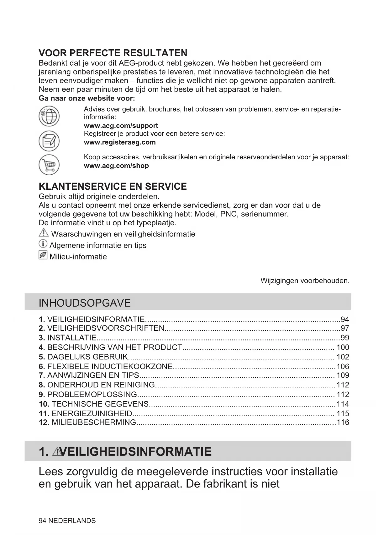 Gebruik altijd originele onderdelen. Als u contact opneemt met onze erkende servicedienst, zorg er dan voor dat u de volgende gegevens tot uw beschikking hebt: Model, PNC, serienummer. De informatie vindt u op het typeplaatje. Waarschuwingen en veiligheidsinformatie Algemene informatie en tips Milieu-informatie Wijzigingen voorbehouden. INHOUDSOPGAVE