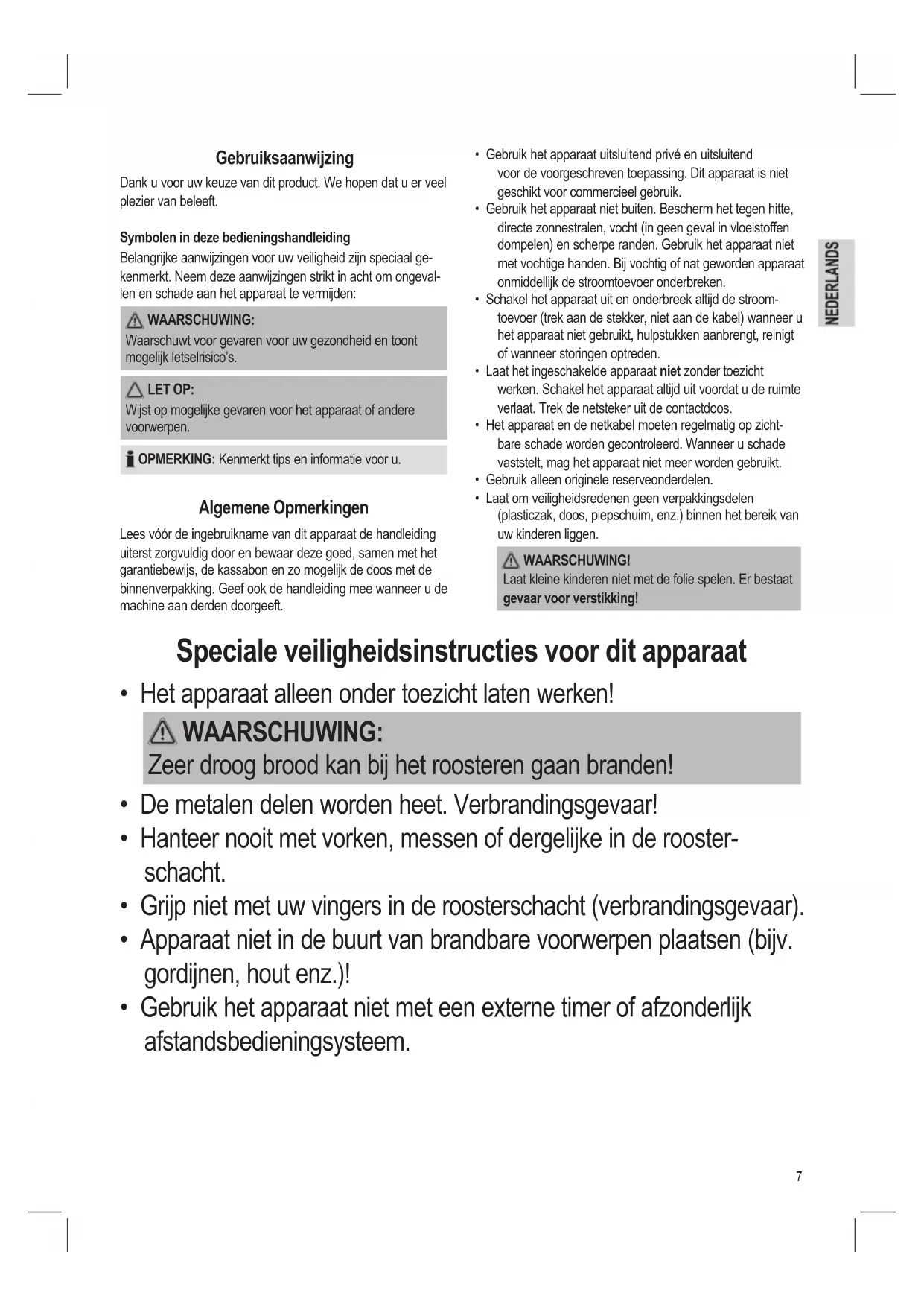 - Het apparaat alleen onder toezicht laten werken! WAARSCHUWING: Zeer droog brood kan bij het roosteren gaan branden!