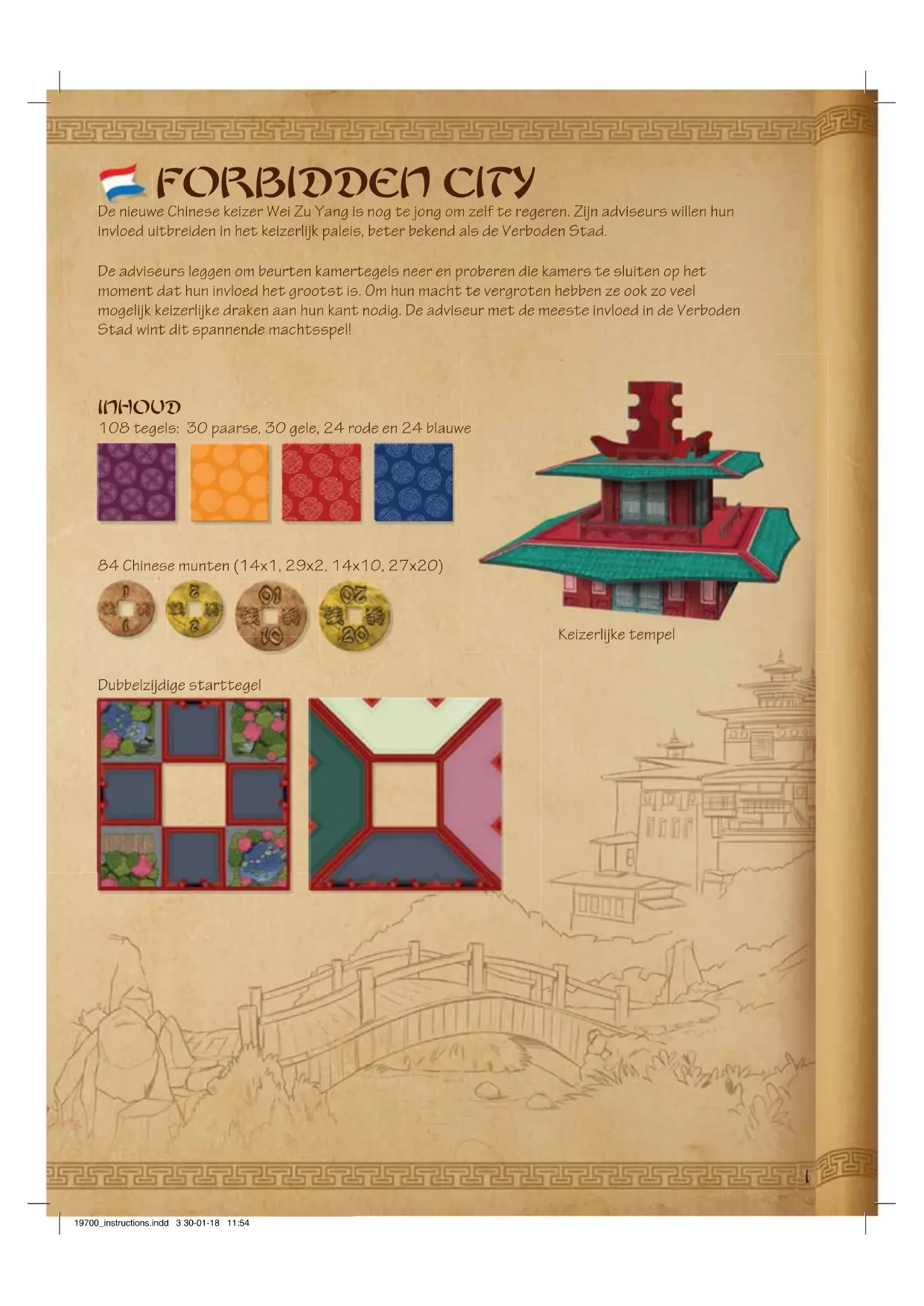 19700_instructions.indd 1 30-01-18 11:5119700_instructions.indd 2 30-01-18 11:52FORBIDDEN CITY De nieuwe Chinese keizer Wei Zu Yang is nog te jong om zelf te regeren. Zijn adviseurs willen hun invloed uitbreiden in het keizerlijk paleis, beter bekend als de Verboden Stad. De adviseurs leggen om beurten kamertegels neer en proberen die kamers te sluiten op het moment dat hun invloed het grootst is. Om hun macht te vergroten hebben ze ook zo veel mogelijk keizerlijke draken aan hun kant nodig. De adviseur met de meeste invloed in de Verboden Stad wint dit spannende machtsspel! INHOUD 108 tegels: 30 paarse, 30 gele, 24 rode en 24 blauwe 84 Chinese munten (14x1, 29x2, 14x10, 27x20) Dubbelzijdige starttegel