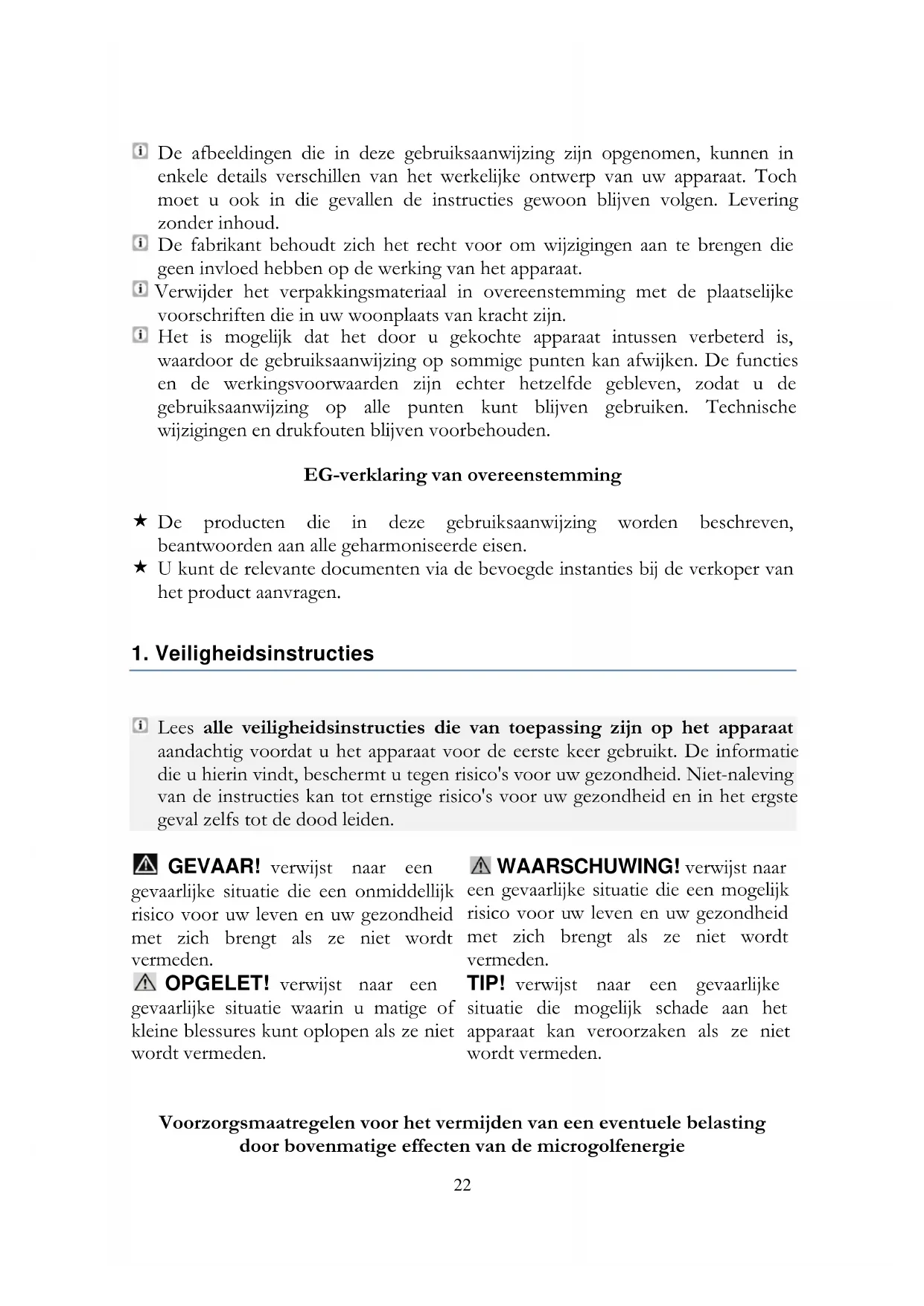 - 8. Garantievoorwaarden De afbeeldingen die in deze gebruiksaanwijzing zijn opgenomen, kunnen in enkele details verschillen van het werkelijke ontwerp van uw apparaat. Toch moet u ook in die gevallen de instructies gewoon blijven volgen. Levering zonder inhoud. De fabrikant behoudt zich het recht voor om wijzigingen aan te brengen die geen invloed hebben op de werking van het apparaat. Verwijder het verpakkingsmateriaal in overeenstemming met de plaatselijke voorschriften die in uw woonplaats van kracht zijn. Het is mogelijk dat het door u gekochte apparaat intussen verbeterd is, waardoor de gebruiksaanwijzing op sommige punten kan afwijken. De functies en de werkingsvoorwaarden zijn echter hetzelfde gebleven, zodat u de gebruiksaanwijzing op alle punten kunt blijven gebruiken. Technische wijzigingen en drukfouten blijven voorbehouden. EG-verklaring van overeenstemming De producten die in deze gebruiksaanwijzing worden beschreven, beantwoorden aan alle geharmoniseerde eisen. U kunt de relevante documenten via de bevoegde instanties bij de verkoper van het product aanvragen. p. 3822