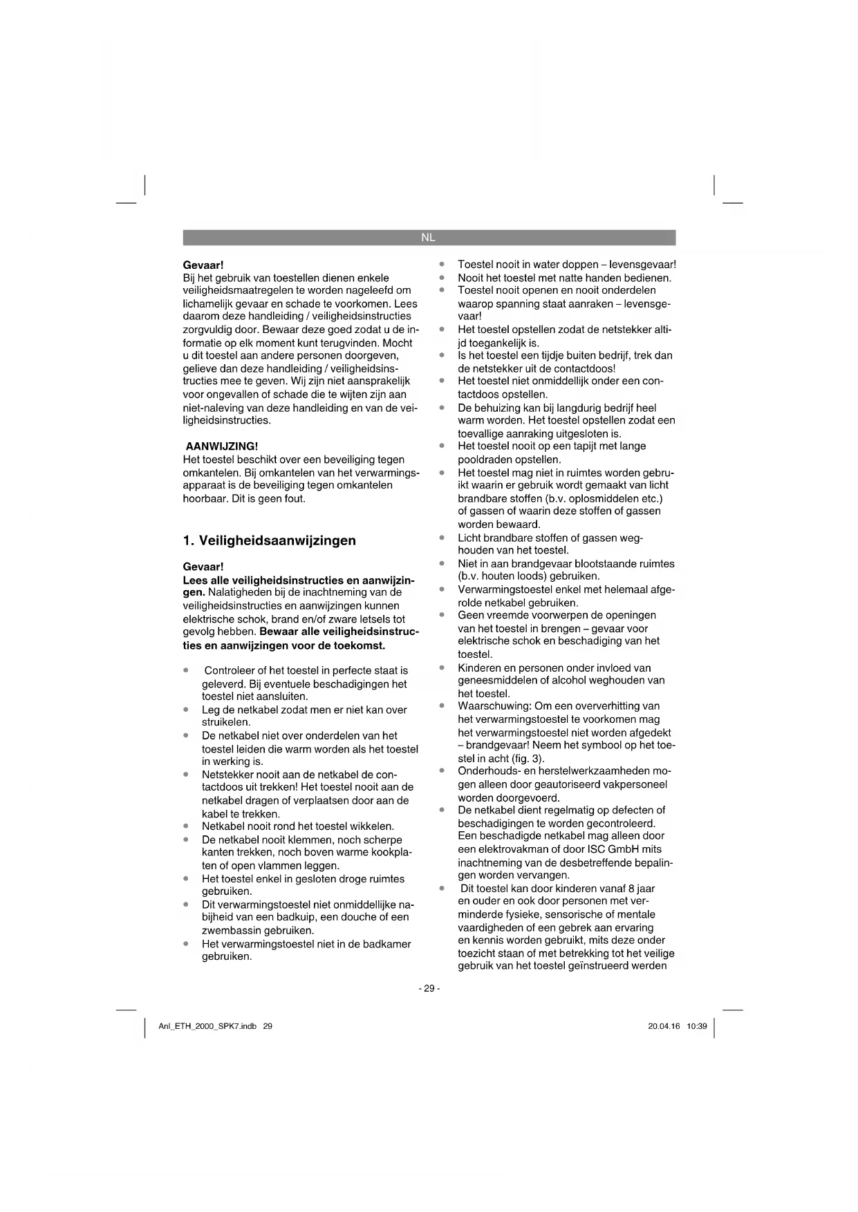 Gevaar! Bij het gebruik van toestellen dienen enkele veiligheidsmaatregelen te worden nageleefd om lichamelijk gevaar en schade te voorkomen. Lees daarom deze handleiding / veiligheidsinstructies zorgvuldig door. Bewaar deze goed zodat u de in- formatie op elk moment kunt terugvinden. Mocht u dit toestel aan andere personen doorgeven, gelieve dan deze handleiding / veiligheidsins- tructies mee te geven. Wij zijn niet aansprakelijk voor ongevallen of schade die te wijten zijn aan niet-naleving van deze handleiding en van de vei- ligheidsinstructies. AANWIJZING! Het toestel beschikt over een beveiliging tegen omkantelen. Bij omkantelen van het verwarmings- apparaat is de beveiliging tegen omkantelen hoorbaar. Dit is geen fout.
