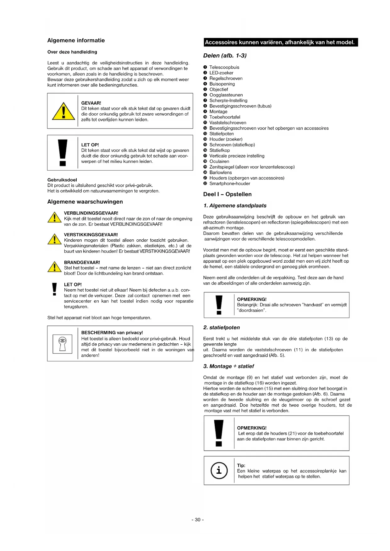 Deze gebruiksaanwijzing beschrijft de opbouw en het gebruik van refractoren (lenstelescopen) en reflectoren (spiegeltelescopen) met een alt-azimuth montage. Daarom bevatten delen van de gebruiksaanwijzing verschillende aanwijzingen voor de verschillende telescoopmodellen. Voordat men met de opbouw begint, moet er eerst een geschikte stand- plaats gevonden worden voor de telescoop. Het zal helpen wanneer het apparaat op een plek opgebouwd word zodat men een vrij zicht heeft op de hemel, een stablele ondergrond en genoeg plek eromheen. Neem eerst alle onderdelen uit de verpakking. Test deze aan de hand van de afbeeldingen of alle onderdelen aanwezig zijn. OPMERKING! Belangrijk: Draai alle schroeven ”handvast” en vermijdt ”doordraaien”.