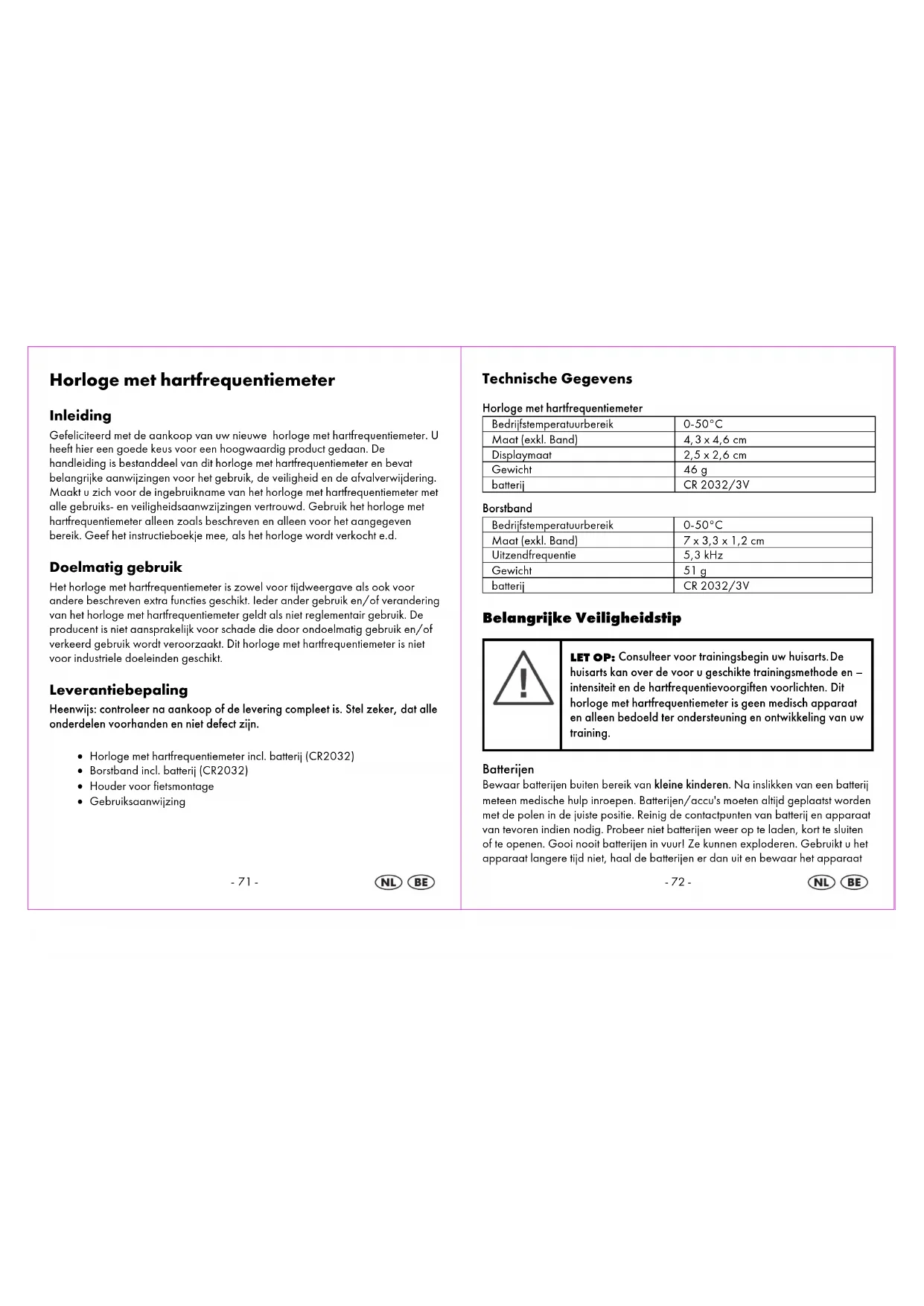 huisarts kan over de voor u geschikte trainingsmethode en – intensiteit en de hartfrequentievoorgiften voorlichten. Dit horloge met hartfrequentiemeter is geen medisch apparaat en alleen bedoeld ter ondersteuning en ontwikkeling van uw training. Batterijen Bewaar batterijen buiten bereik van kleine kinderen. Na inslikken van een batterij meteen medische hulp inroepen. Batterijen/accu's moeten altijd geplaatst worden met de polen in de juiste positie. Reinig de contactpunten van batterij en apparaat van tevoren indien nodig. Probeer niet batterijen weer op te laden, kort te sluiten of te openen. Gooi nooit batterijen in vuur! Ze kunnen exploderen. Gebruikt u het apparaat langere tijd niet, haal de batterijen er dan uit en bewaar het apparaat-
