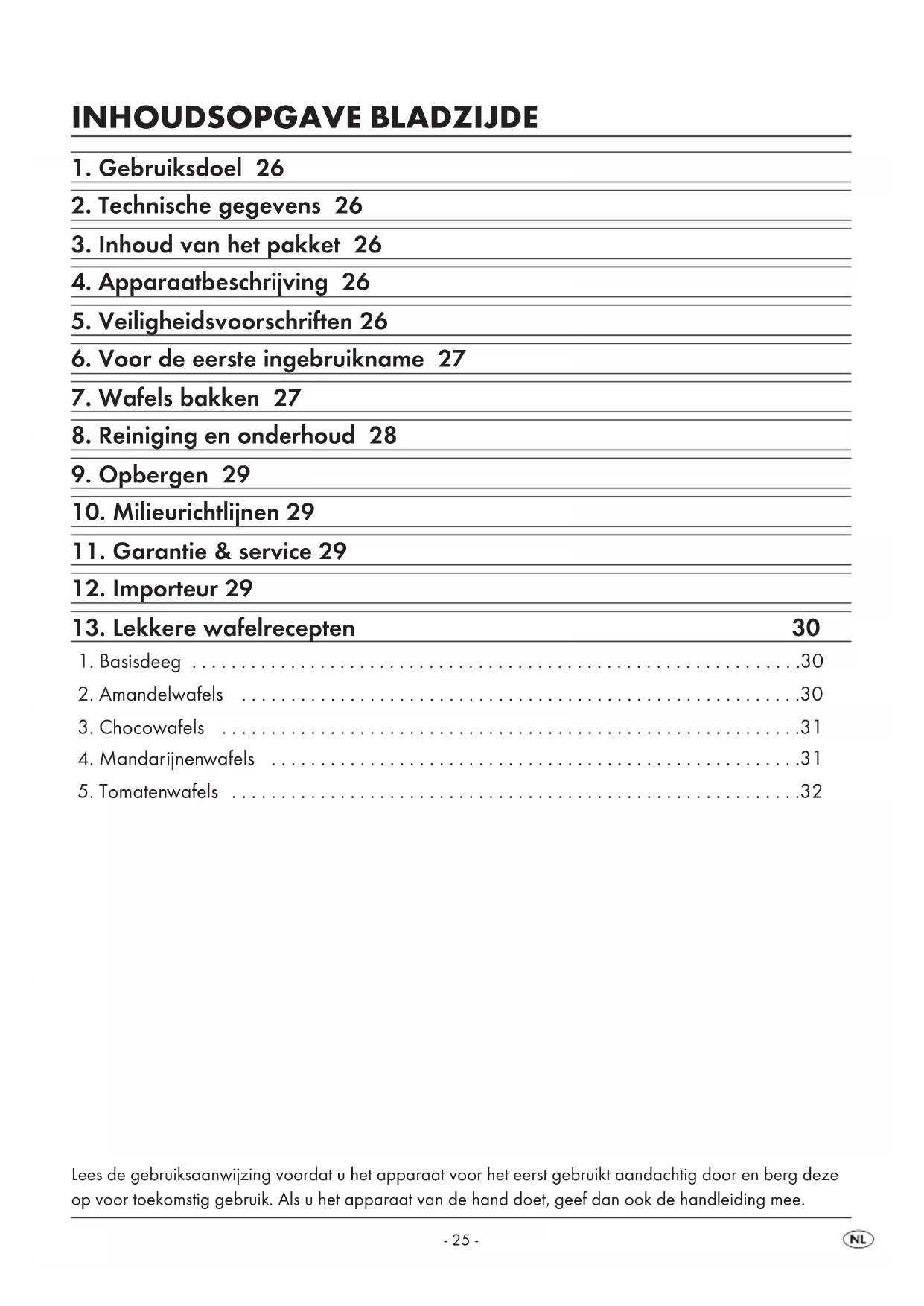 Dit apparaat is bestemd voor het bakken van wafels voor huishoudelijk gebruik. Het is niet bestemd voor de bereiding van andere levensmiddelen en niet voor gebruik in bedrijfsmatige of industriële omgevingen.