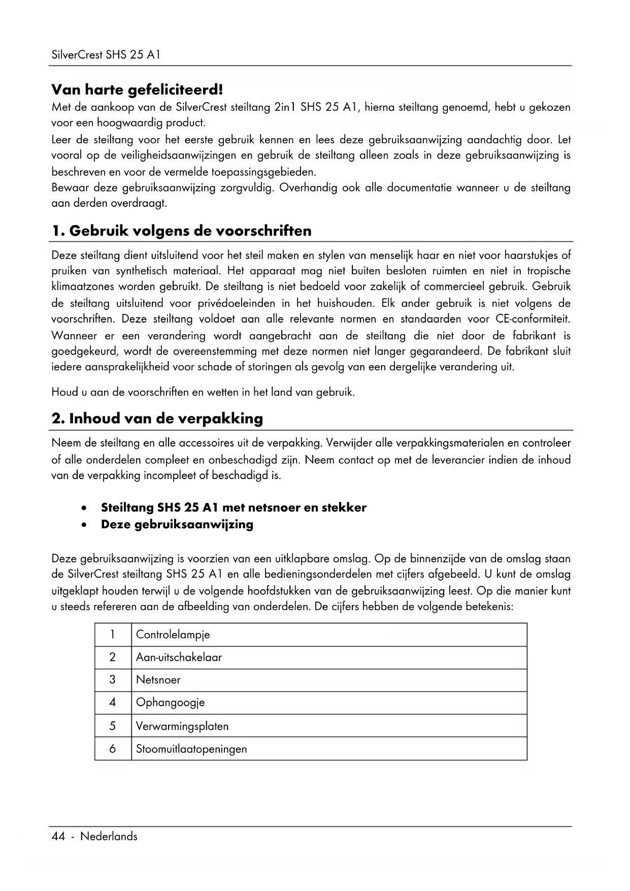 Neem de steiltang en alle accessoires uit de verpakking. Verwijder alle verpakkingsmaterialen en controleer of alle onderdelen compleet en onbeschadigd zijn. Neem contact op met de leverancier indien de inhoud van de verpakking incompleet of beschadigd is. Steiltang SHS 25 A1 met netsnoer en stekker Deze gebruiksaanwijzing Deze gebruiksaanwijzing is voorzien van een uitklapbare omslag. Op de binnenzijde van de omslag staan de SilverCrest steiltang SHS 25 A1 en alle bedieningsonderdelen met cijfers afgebeeld. U kunt de omslag uitgeklapt houden terwijl u de volgende hoofdstukken van de gebruiksaanwijzing leest. Op die manier kunt u steeds refereren aan de afbeelding van onderdelen. De cijfers hebben de volgende betekenis: 1 Controlelampje 2 Aan-uitschakelaar 3 Netsnoer 4 Ophangoogje 5 Verwarmingsplaten 6 StoomuitlaatopeningenSilverCrest SHS 25 A1 Nederlands - 45