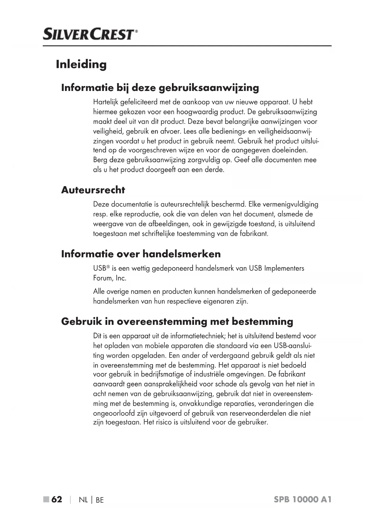 SPB 10000 A1 Inleiding Informatie bij deze gebruiksaanwijzing Hartelijk gefeliciteerd met de aankoop van uw nieuwe apparaat. U hebt hiermee gekozen voor een hoogwaardig product. De gebruiksaanwijzing maakt deel uit van dit product. Deze bevat belangrijke aanwijzingen voor veiligheid, gebruik en afvoer. Lees alle bedienings- en veiligheidsaanwij- zingen voordat u het product in gebruik neemt. Gebruik het product uitslui- tend op de voorgeschreven wijze en voor de aangegeven doeleinden. Berg deze gebruiksaanwijzing zorgvuldig op. Geef alle documenten mee als u het product doorgeeft aan een derde. Auteursrecht Deze documentatie is auteursrechtelijk beschermd. Elke vermenigvuldiging resp. elke reproductie, ook die van delen van het document, alsmede de weergave van de afbeeldingen, ook in gewijzigde toestand, is uitsluitend toegestaan met schriftelijke toestemming van de fabrikant. Informatie over handelsmerken USB