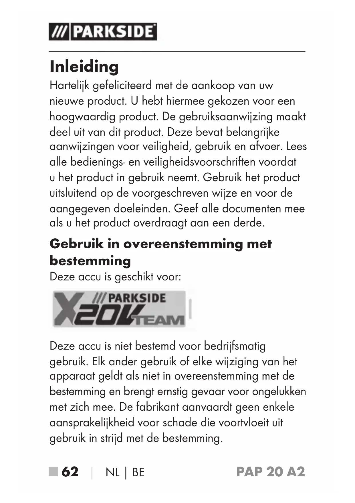 - Telefonische bestelling PAP 20 A2■ 62 │ NL│BE Inleiding Hartelijk gefeliciteerd met de aankoop van uw nieuwe product. U hebt hiermee gekozen voor een hoogwaardig product. De gebruiksaanwijzing maakt deel uit van dit product. Deze bevat belangrijke aanwijzingen voor veiligheid, gebruik en afvoer. Lees alle bedienings- en veiligheidsvoorschriften voordat u het product in gebruik neemt. Gebruik het product uitsluitend op de voorgeschreven wijze en voor de aangegeven doeleinden. Geef alle documenten mee als u het product overdraagt aan een derde. Gebruik in overeenstemming met bestemming Deze accu is geschikt voor: Deze accu is niet bestemd voor bedrijfsmatig gebruik. Elk ander gebruik of elke wijziging van het apparaat geldt als niet in overeenstemming met de bestemming en brengt ernstig gevaar voor ongelukken met zich mee. De fabrikant aanvaardt geen enkele aansprakelijkheid voor schade die voortvloeit uit gebruik in strijd met de bestemming.PAP 20 A2 NL│BE │ 63 ■ Uitrusting Accupack Toets Accutoestand Accu-display-LED Snellader (niet meegeleverd) Rode controle-LED voor opladen Groene controle-LED voor opladen Inhoud van het pakket 1 accu 3 Ah 1 gebruiksaanwijzing Technische gegevens Accu 3 Ah: PAP 20 A2 Type: LITHIUM-ION Nominale spanning: 20 V (gelijkstroom) Capaciteit: 3,0 Ah Cellen: 10PAP 20 A2■ 64 │ NL│BE Gebruik voor het opladen van het accupack alleen de volgende oplader: X20V Team Serie (niet meegeleverd) PLG 20 A2: INGANG/Input: Nominale spanning: 230 - 240 V p. 79