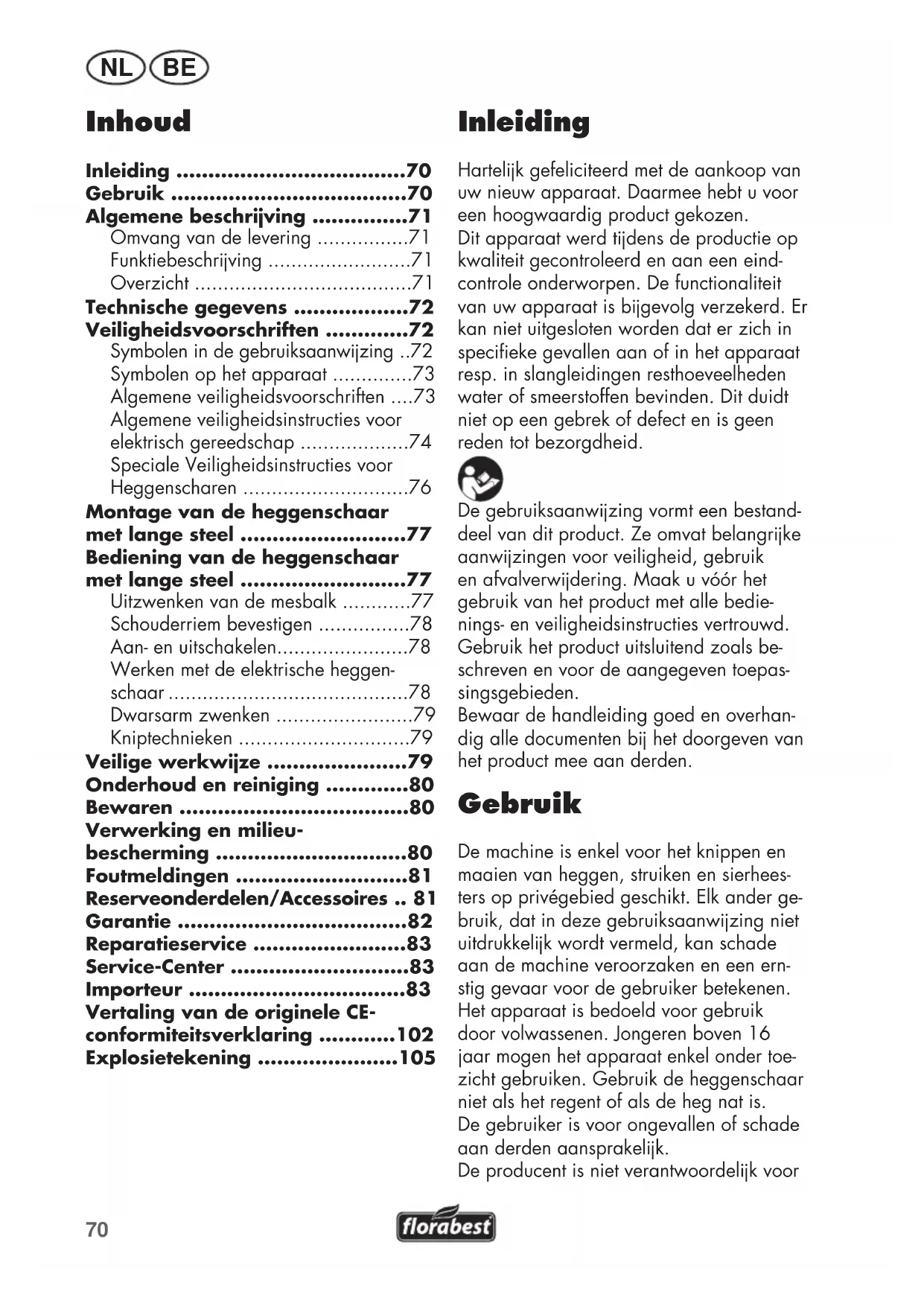 - Explosietekening Inleiding Hartelk gefeliciteerd met de aankoop van uw nieuw apparaat. Daarmee hebt u voor een hoogwaardig product gekozen. Dit apparaat werd tdens de productie op kwaliteit gecontroleerd en aan een eind- controle onderworpen. De functionaliteit van uw apparaat is bgevolg verzekerd. Er kan niet uitgesloten worden dat er zich in specieke gevallen aan of in het apparaat resp. in slangleidingen resthoeveelheden water of smeerstoffen bevinden. Dit duidt niet op een gebrek of defect en is geen reden tot bezorgdheid. De gebruiksaanwzing vormt een bestand- deel van dit product. Ze omvat belangrke aanwzingen voor veiligheid, gebruik en afvalverwdering. Maak u vóór het gebruik van het product met alle bedie- nings- en veiligheidsinstructies vertrouwd. Gebruik het product uitsluitend zoals be- schreven en voor de aangegeven toepas- singsgebieden. Bewaar de handleiding goed en overhan- dig alle documenten b het doorgeven van het product mee aan derden. Gebruik De machine is enkel voor het knippen en maaien van heggen, struiken en sierhees- ters op privégebied geschikt. Elk ander ge- bruik, dat in deze gebruiksaanwzing niet uitdrukkelk wordt vermeld, kan schade aan de machine veroorzaken en een ern- stig gevaar voor de gebruiker betekenen. Het apparaat is bedoeld voor gebruik door volwassenen. Jongeren boven 16 jaar mogen het apparaat enkel onder toe- zicht gebruiken. Gebruik de heggenschaar niet als het regent of als de heg nat is. De gebruiker is voor ongevallen of schade aan derden aansprakelk. De producent is niet verantwoordelk voor71 BENL beschadigingen, die door onrechtmatig gebruik of verkeerde bediening worden veroorzaakt. Gebruik de machine niet als het mes stomp is. Stark versiete mes-balk kann schade aan de machine veroorzaken. Mesbalk regelmatig laten slpen. Algemene beschrving De afbeeldingen kunt u vinden op de voorste uitklappagina. Omvang van de levering - Heggenschaar met lange steel (tweedelig)- Maaibescherming- Beenbescherming- Schouderriem- Ronde handgreep- Inbussleutel- Gebruiksaanwzing Funktiebeschrving De elektrische heggenschaar bezit een elektrische motor als aandrving. Het toe-stel is voor de veiligheid dubbel geïsoleerd en hoeft geen aarding.De heggenschaar beschikt over een dub-belzdige mesbalk met veiligheidsmessen. B het snden bewegen de messen lineair heen en weer. De stootbeveiliging aan het uiteinde van de mesbalk voorkomt onaan-gename terugslagen als er bvoorbeeld een muur of hekwerk wordt geraakt.Om de gebruiker te beschermen, kan het apparaat alleen worden ingeschakeld als de veiligheidsschakelaar wordt ingedrukt. De handbescherming beschermt ook tegen takken en twgen.De funktie van de bedieningselementen leest u in de volgende beschrvingen. Overzicht p. 105