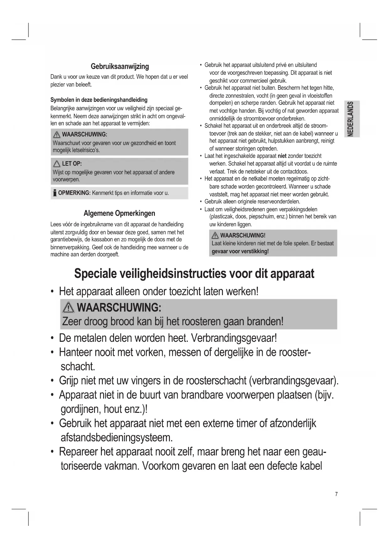- Het apparaat alleen onder toezicht laten werken! WAARSCHUWING: Zeer droog brood kan bij het roosteren gaan branden!