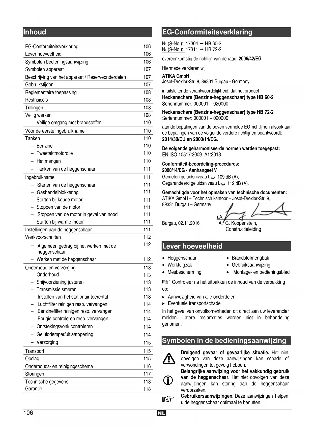 112 dB (A). Gemachtigde voor het opmaken van technische documenten: ATIKA GmbH – Technisch kantoor – Josef-Drexler-Str. 8, 89331 Burgau – Germany i.A. Burgau, 02.11.2016 i.A. G. Koppenstein, Constructieleiding