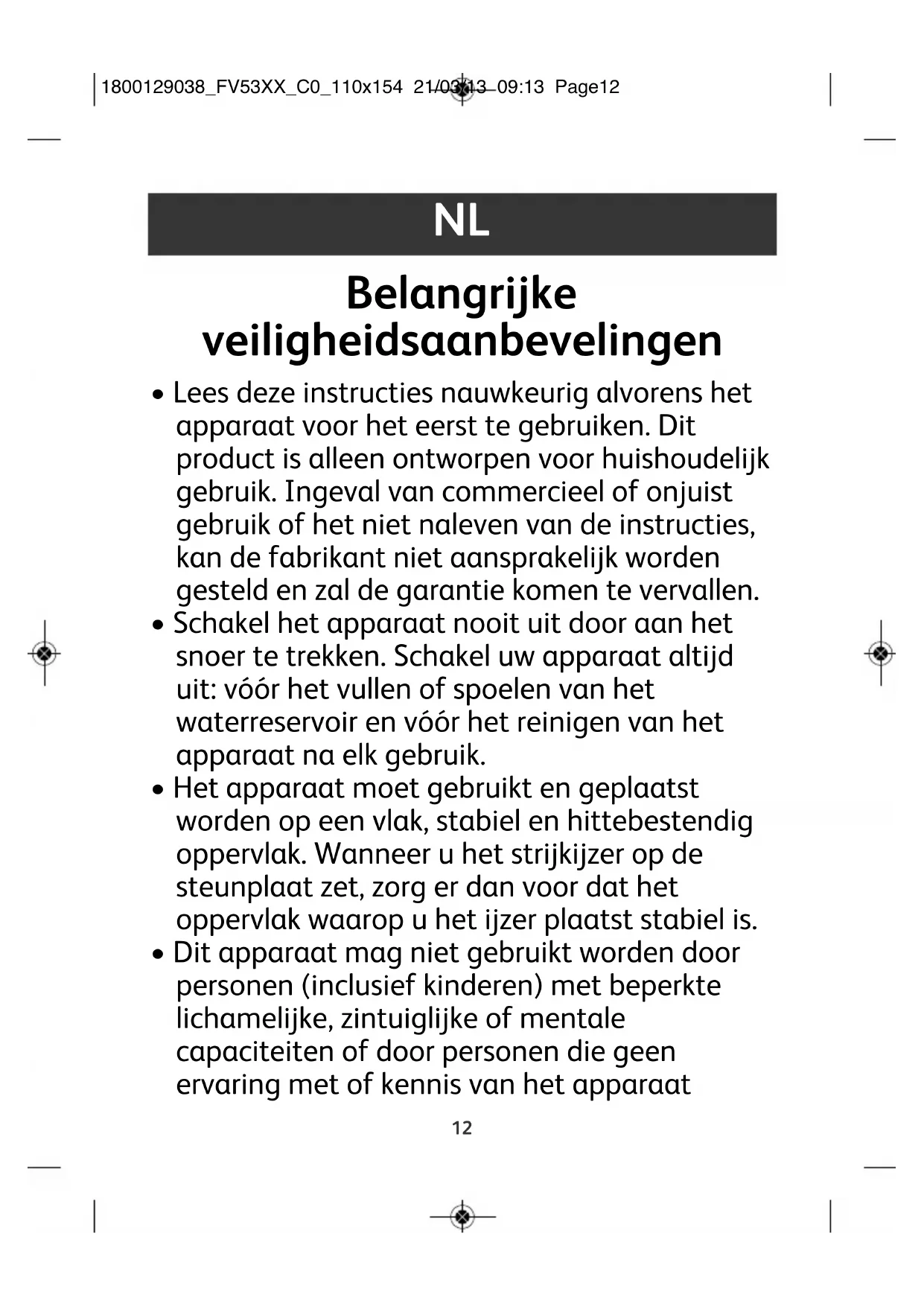 - Dit apparaat mag niet gebruikt worden door personen (inclusief kinderen) met beperkte lichamelijke, zintuiglijke of mentale capaciteiten of door personen die geen ervaring met of kennis van het apparaat 1800129038_FV53XX_C0_110x154 21/03/13 09:13 Page1213