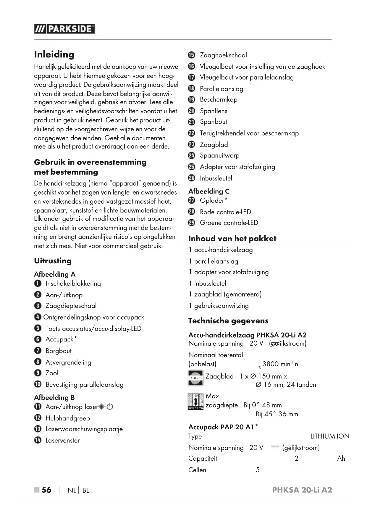 Inleiding Hartelijk gefeliciteerd met de aankoop van uw nieuwe apparaat. U hebt hiermee gekozen voor een hoog- waardig product. De gebruiksaanwijzing maakt deel uit van dit product. Deze bevat belangrijke aanwij- zingen voor veiligheid, gebruik en afvoer. Lees alle bedienings- en veiligheidsvoorschriften voordat u het product in gebruik neemt. Gebruik het product uit- sluitend op de voorgeschreven wijze en voor de aangegeven doeleinden. Geef alle documenten mee als u het product overdraagt aan een derde. Gebruik in overeenstemming met bestemming De handcirkelzaag (hierna “apparaat” genoemd) is geschikt voor het zagen van lengte- en dwarssnedes en versteksnedes in goed vastgezet massief hout, spaanplaat, kunststof en lichte bouwmaterialen. Elk ander gebruik of modificatie van het apparaat geldt als niet in overeenstemming met de bestem- ming en brengt aanzienlijke risico's op ongelukken met zich mee. Niet voor commercieel gebruik. Uitrusting Afbeelding A Inschakelblokkering Aan-/uitknop Zaagdiepteschaal Ontgrendelingsknop voor accupack Toets accustatus/accu-display-LED Accupack* Borgbout Asvergrendeling Zool Bevestiging parallelaanslag Afbeelding B Aan-/uitknop laser Hulphandgreep Laserwaarschuwingsplaatje Laservenster Zaaghoekschaal Vleugelbout voor instelling van de zaaghoek Vleugelbout voor parallelaanslag Parallelaanslag Beschermkap Spanflens Spanbout Terugtrekhendel voor beschermkap Zaagblad Spaanuitworp Adapter voor stofafzuiging Inbussleutel Afbeelding C Oplader* Rode controle-LED Groene controle-LED Inhoud van het pakket 1 accu-handcirkelzaag 1 parallelaanslag 1 adapter voor stofafzuiging 1 inbussleutel 1 zaagblad (gemonteerd) 1 gebruiksaanwijzing Technische gegevens Accu-handcirkelzaag PHKSA 20-Li A2 Nominale spanning 20 V (gelijkstroom) Nominaal toerental (onbelast) n