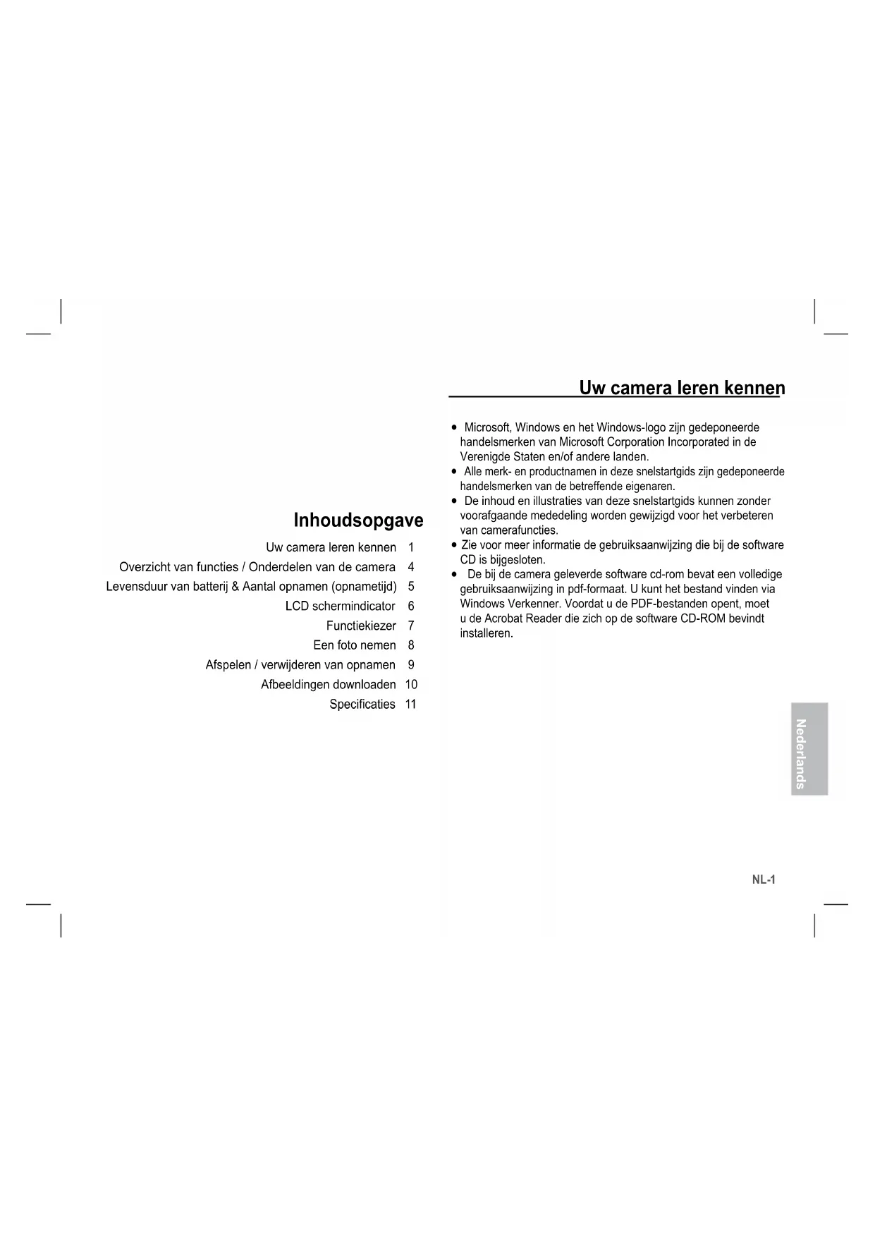 Inhoudsopgave Uw camera leren kennen Overzicht van functies / Onderdelen van de camera Levensduur van batterij & Aantal opnamen (opnametijd) LCD schermindicator Functiekiezer Een foto nemen Afspelen / verwijderen van opnamen Afbeeldingen downloaden Specicaties Uw camera leren kennen