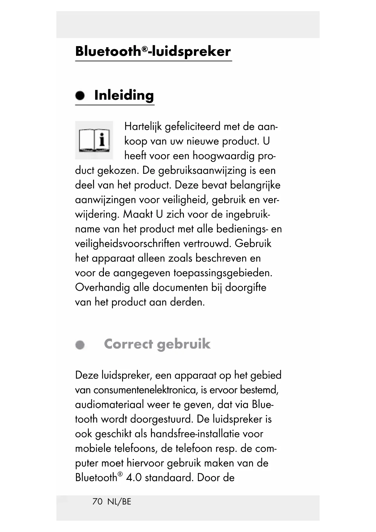 -luidspreker Inleiding Hartelijk gefeliciteerd met de aan- koop van uw nieuwe product. U heeft voor een hoogwaardig pro- duct gekozen. De gebruiksaanwijzing is een deel van het product. Deze bevat belangrijke aanwijzingen voor veiligheid, gebruik en ver- wijdering. Maakt U zich voor de ingebruik- name van het product met alle bedienings- en veiligheidsvoorschriften vertrouwd. Gebruik het apparaat alleen zoals beschreven en voor de aangegeven toepassingsgebieden. Overhandig alle documenten bij doorgifte van het product aan derden. Correct gebruik Deze luidspreker, een apparaat op het gebied van consumentenelektronica, is ervoor bestemd, audiomateriaal weer te geven, dat via Blue- tooth wordt doorgestuurd. De luidspreker is ook geschikt als handsfree-installatie voor mobiele telefoons, de telefoon resp. de com- puter moet hiervoor gebruik maken van de Bluetooth
